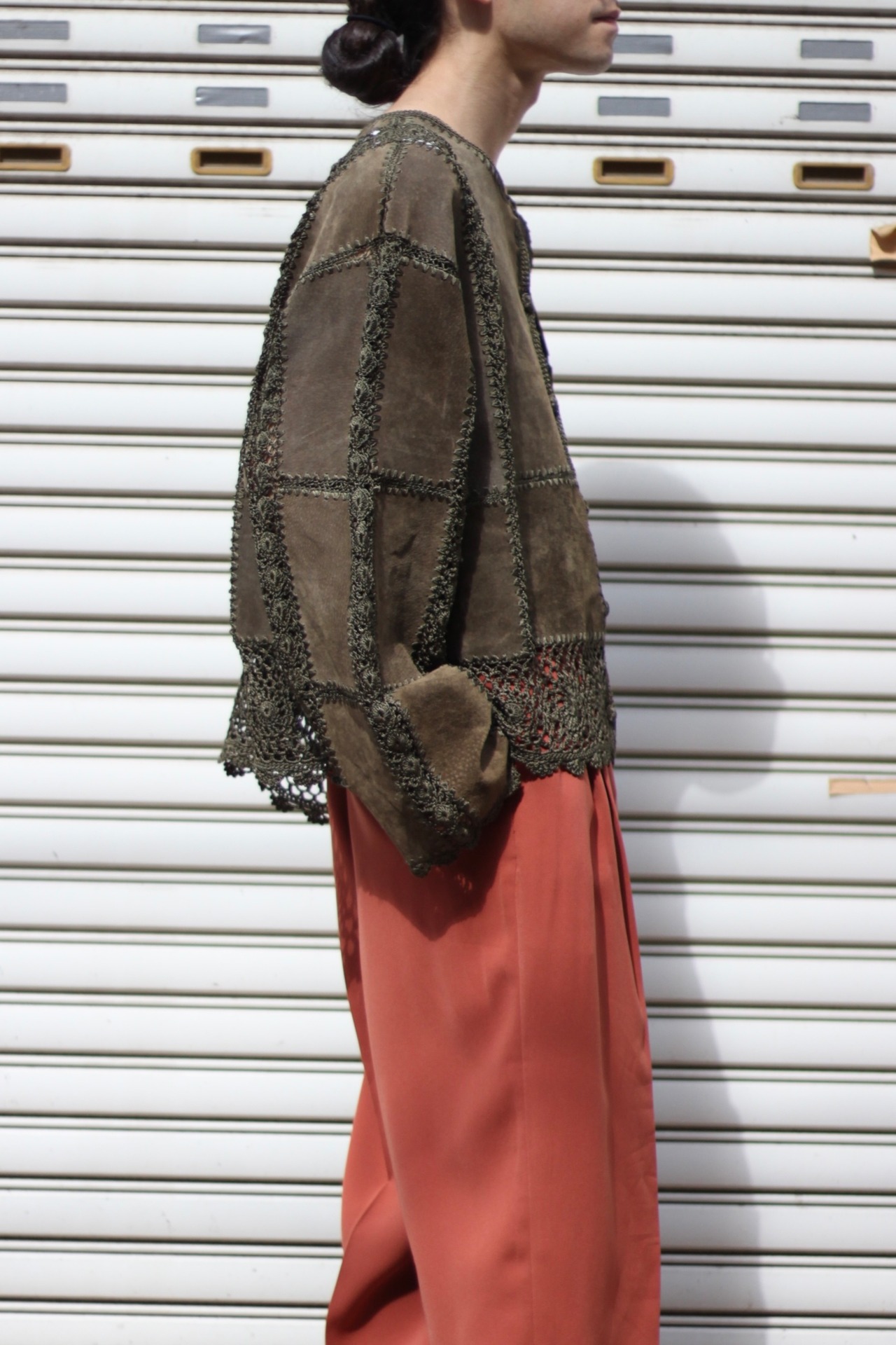 【OTSU】short length suede leather × lace design no collar jacket -8538-