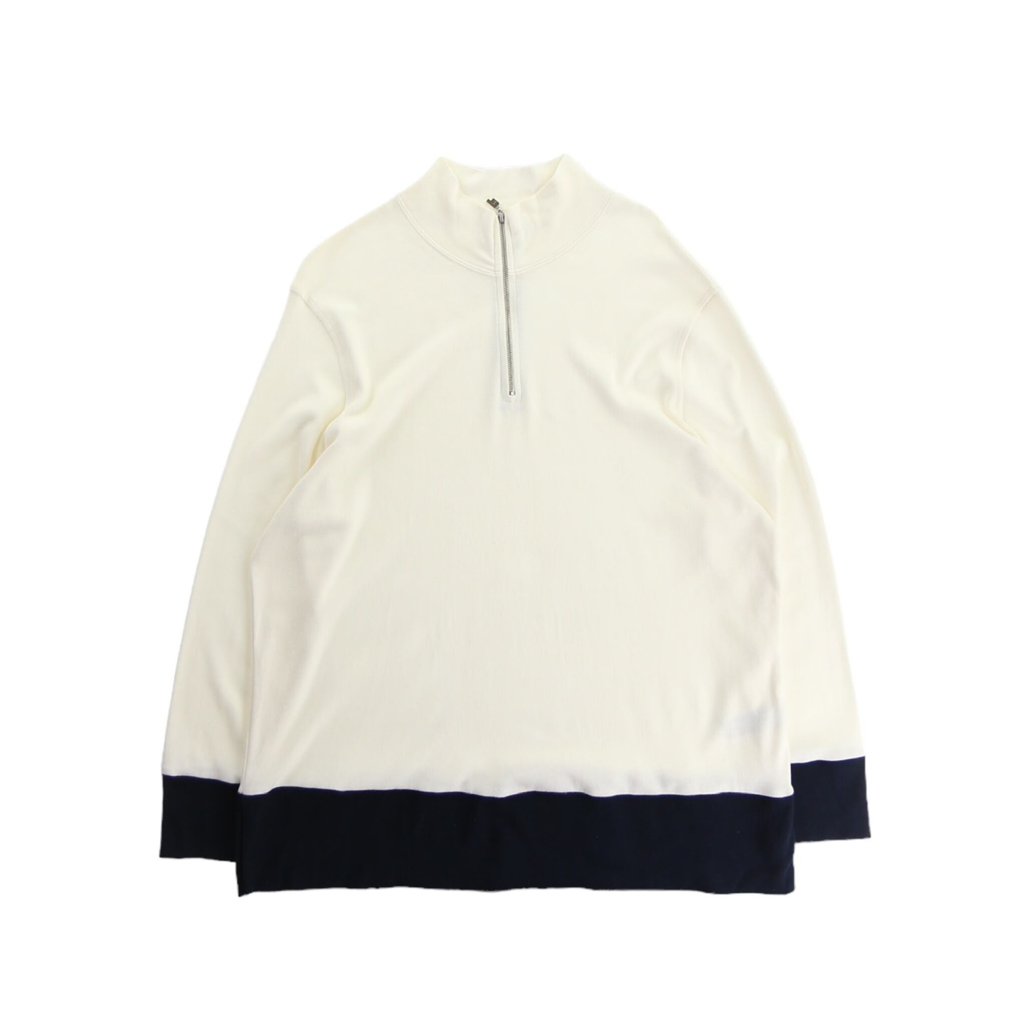 ホワイトボディにダークネイビーのバイカラー。ネイビー部分に関してはほぼ黒のような物なので汎用性も◎普通のロンTにはには出せない存在感があります。ハーフジップアイテムはこれからの時期着やすく馴染みが良くインナーとしても1枚でもバッチリ使えます◎