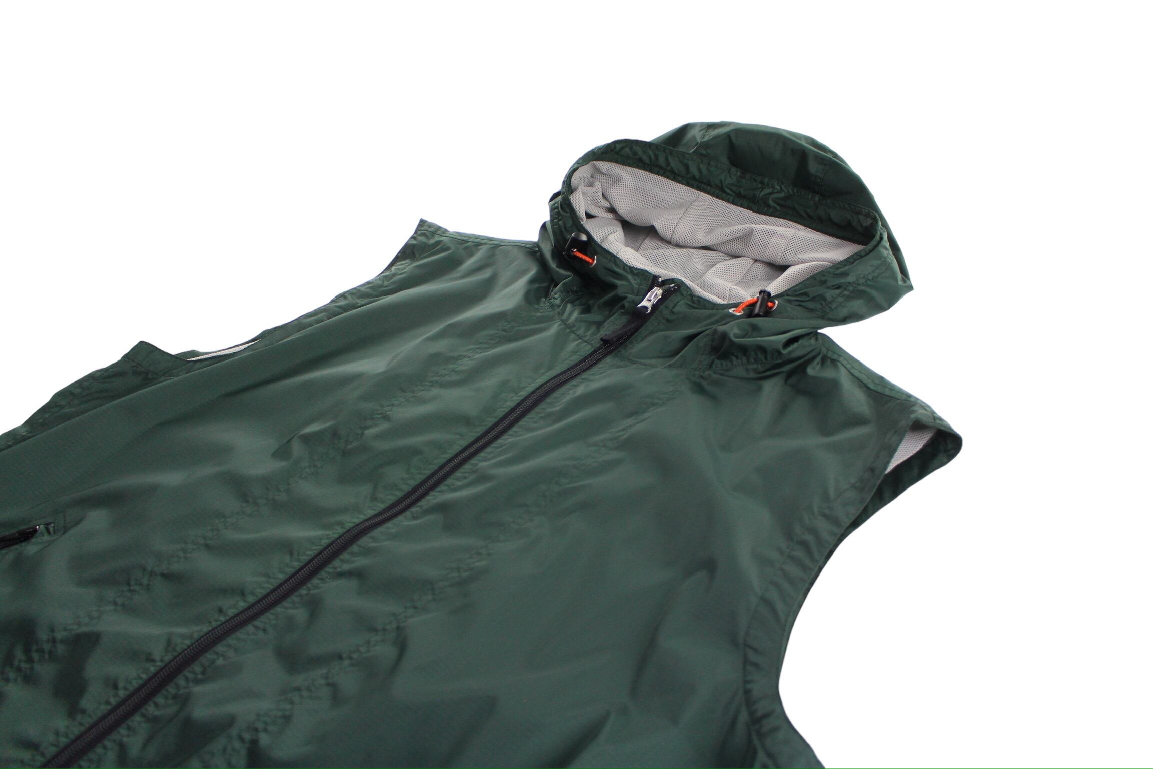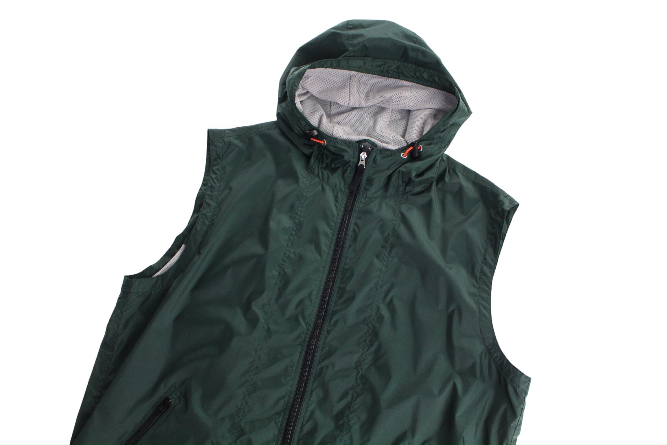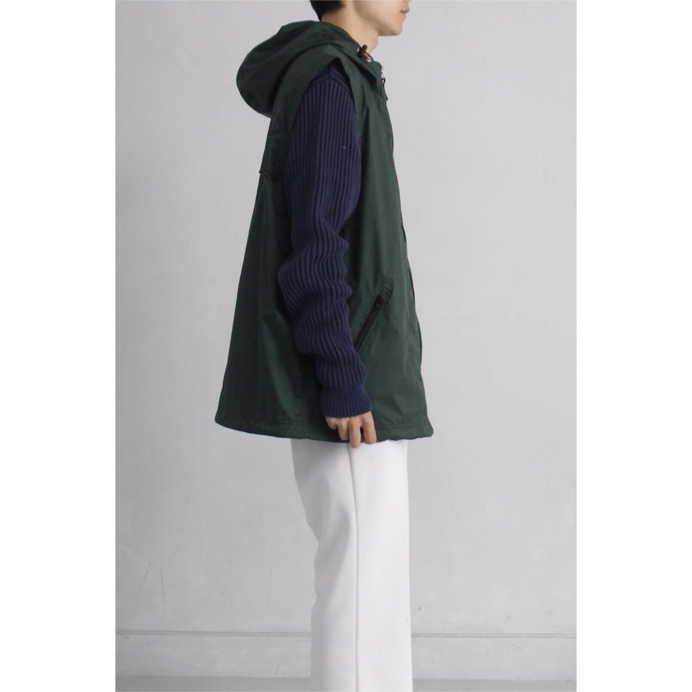 GAPといえば古着市場では名作と位置付けられた王道なアイテムのナイロンアノラックパーカはよく見かけますが,アーム部分を無くしフルジップアップにした初見デザイン。サイドのジップポケット。フード,裾に各所ドローコード完備。ドローコードはグリーンボディに映えるオレンジが良い。