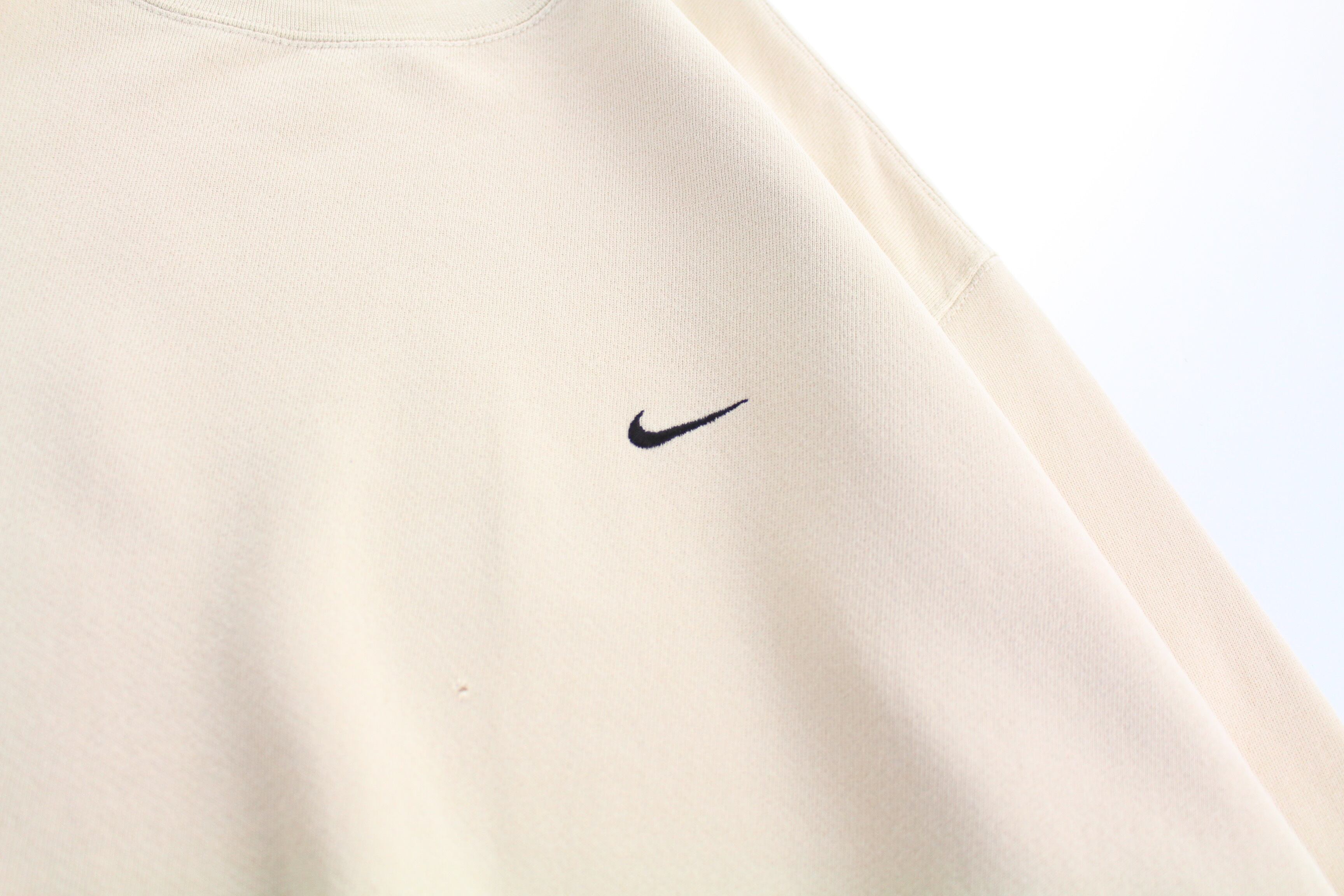 NIKEのライトベージュカラーのワンポイントスウォッシュロゴのクルーネックスウェットです