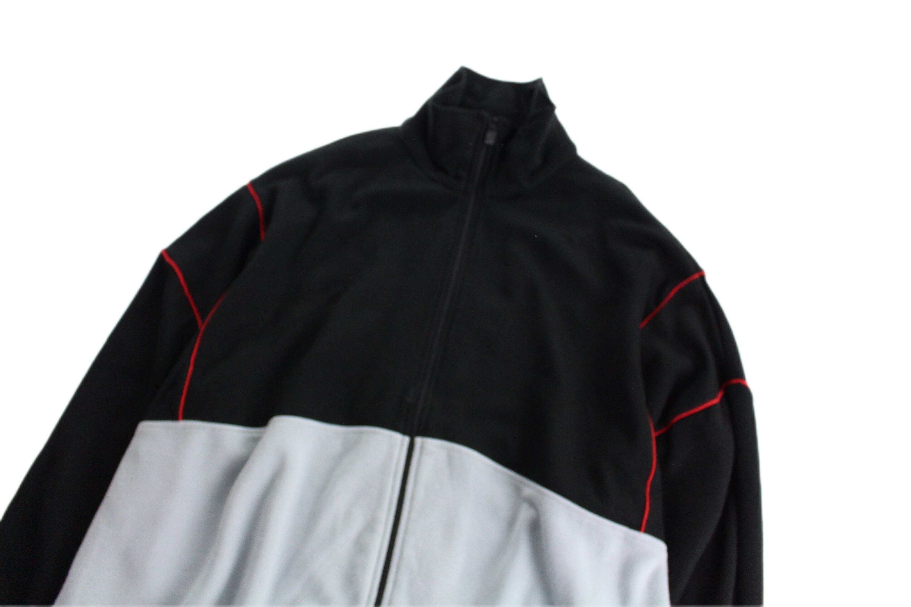 上下でカラー使いが違いブラックとライトグレーのモノトーンの配色にレッドのパイピングが映えます。デザインが良く,ラフながらもだらしなくならない秀逸なアイテムかと。