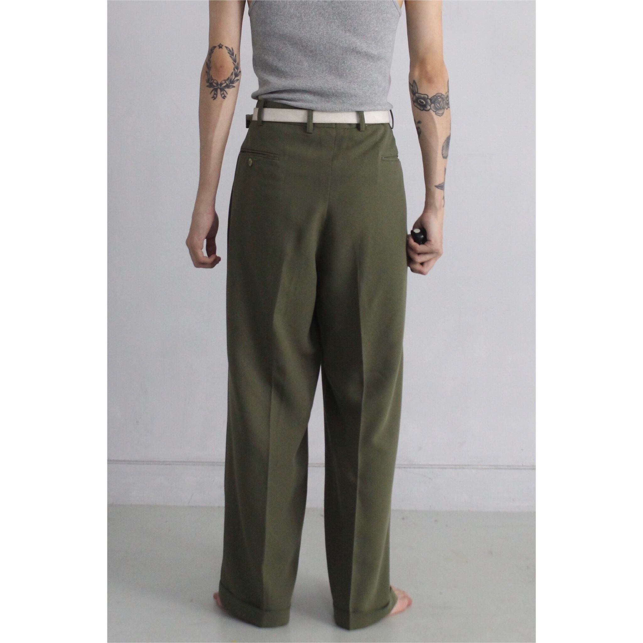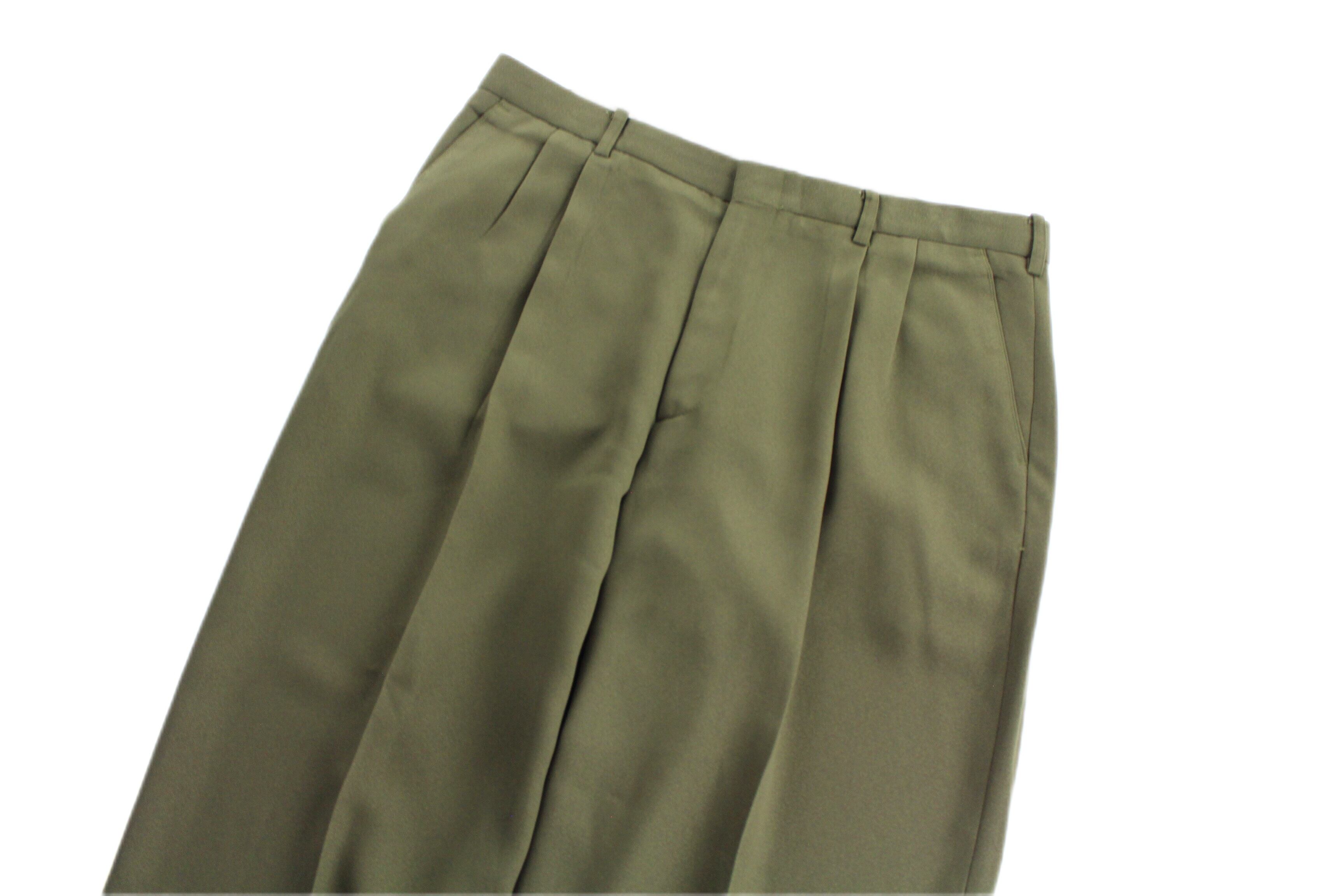 とろみポリエステルの程よく肉厚な生地感でドレープ感もあり上品さが伝わるアイテム。抹茶グリーンのキメすぎな感じもなく雰囲気抜群のセットアップ。