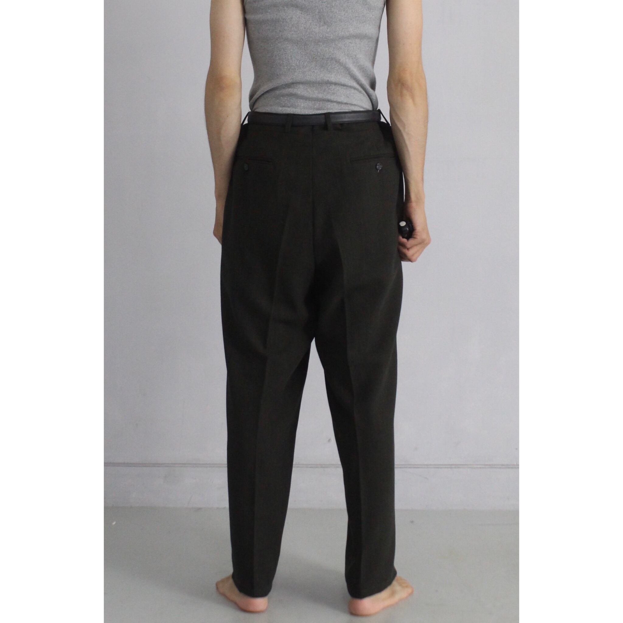 ダークオリーブの光に当たると輝くほんのり玉虫ライクなピュアニューウールの滑らかな生地に織柄が見せる無地ながらも柄感を感じさせるデザイン性。ウールながらも起毛感は全くなくとろみのある生地にオチ感も楽しめるファブリック。裏地はブラウンアセテート。こちらも光沢感ありとてもラグジュアリーな雰囲気。