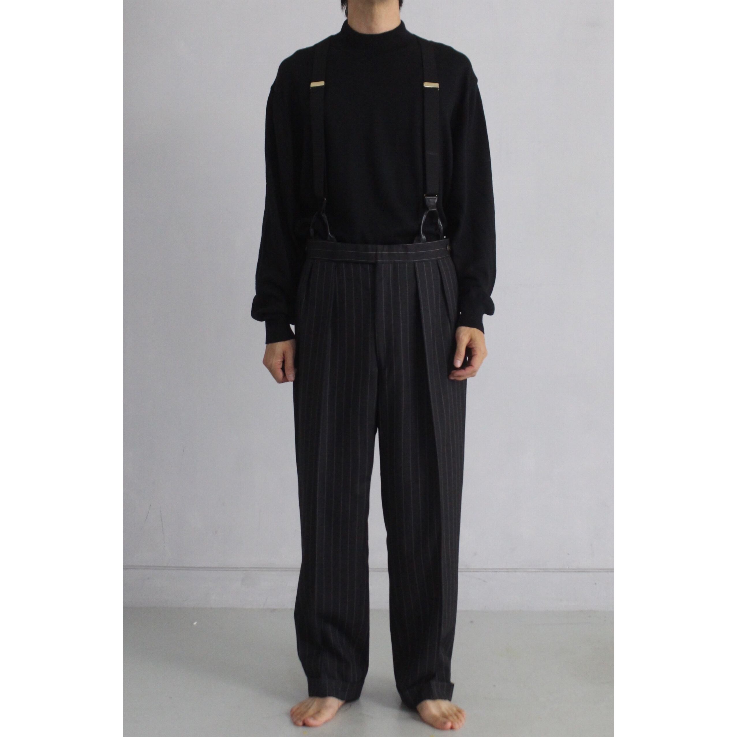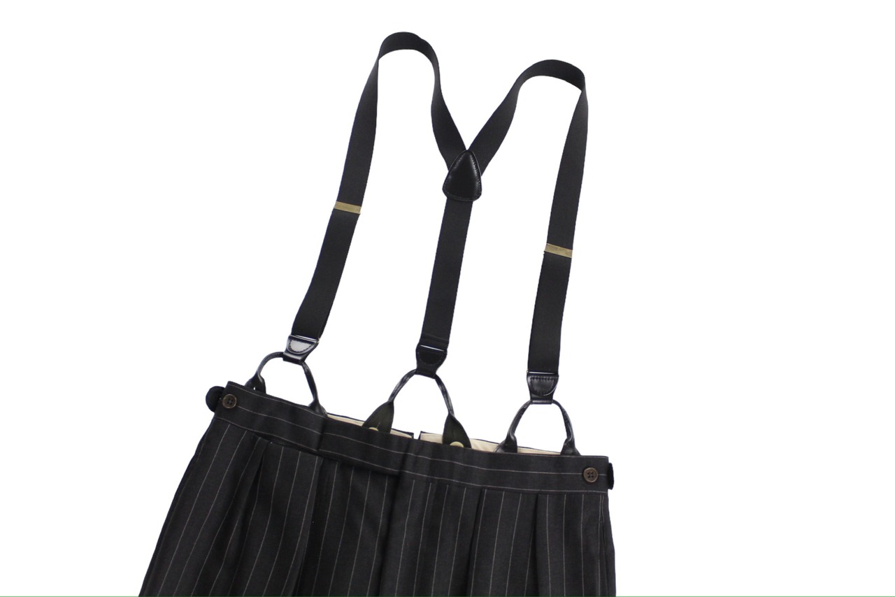 パンツはセミワイドのゆとりをもって作られた2タックスラックス。ベルトループがない分サイドにはゴム紐のアジャスターとサスペンダー付きのスペシャルスラックス。サスペンダー自体のクオリティも高くブラック×ゴールドのゴージャスな付属品。ジャケット同様ポケット上部にはコインポケットも完備。