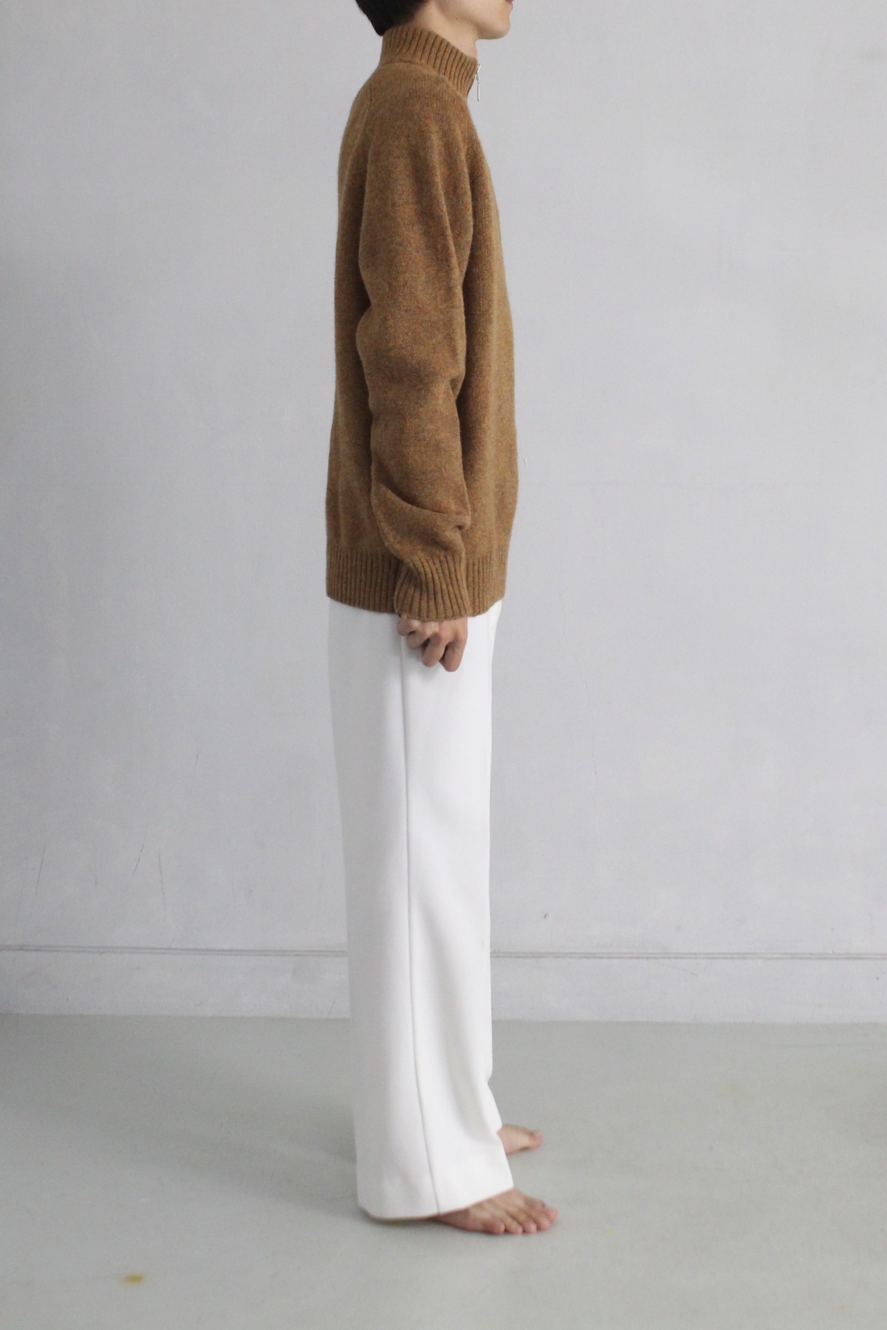 ネックも高めで一枚で着る時のシルエットも素晴らしい。アウター、コートのインナーでも合わせていただけるいいニットです。