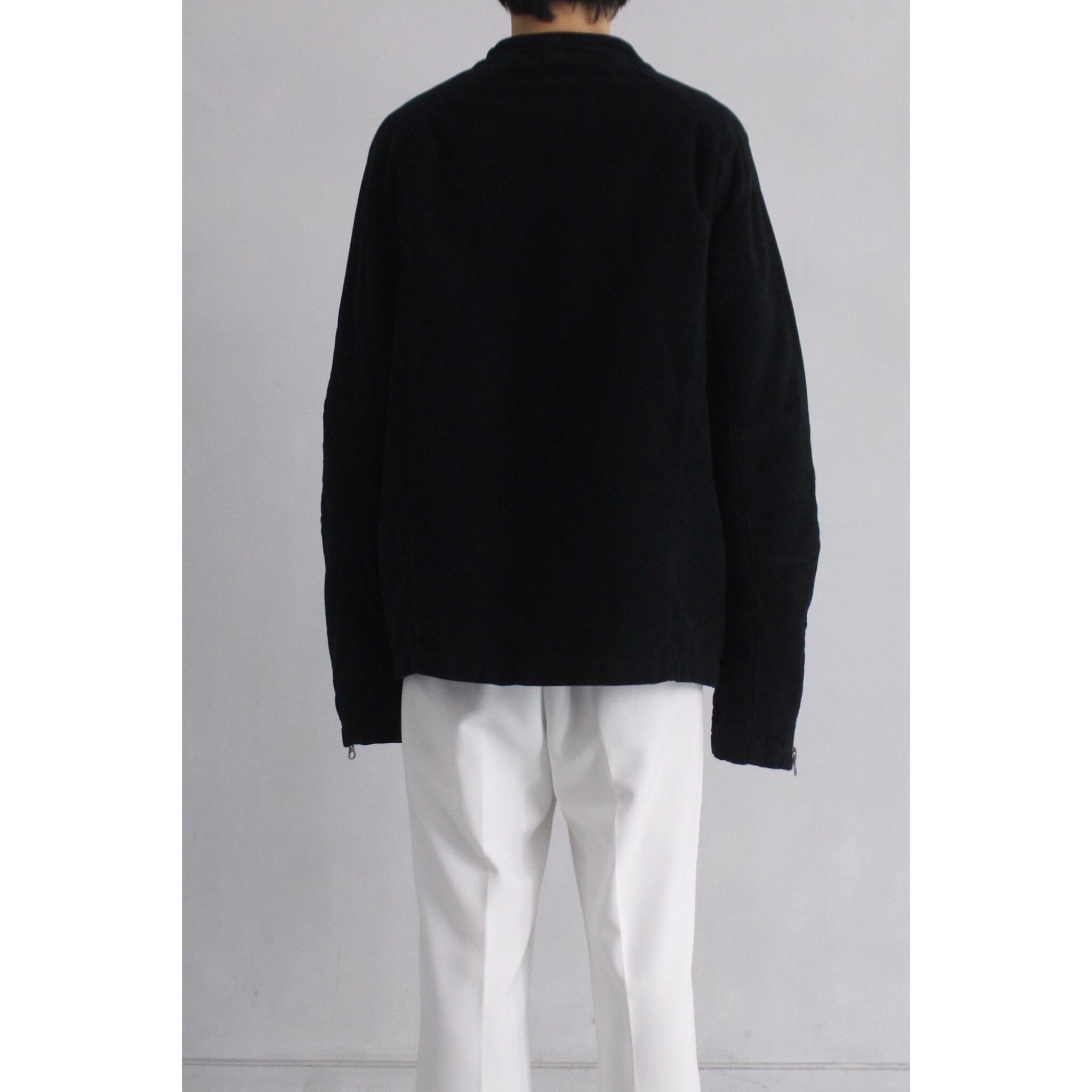 シングルライダースのディテールが随所に施されたブルゾンで特徴的な丸襟にスナップボタン。両サイドスラッシュポケット+ジップアップ式の胸ポケット,内ポケットも完備。袖口にもジップが付き開閉も可能。