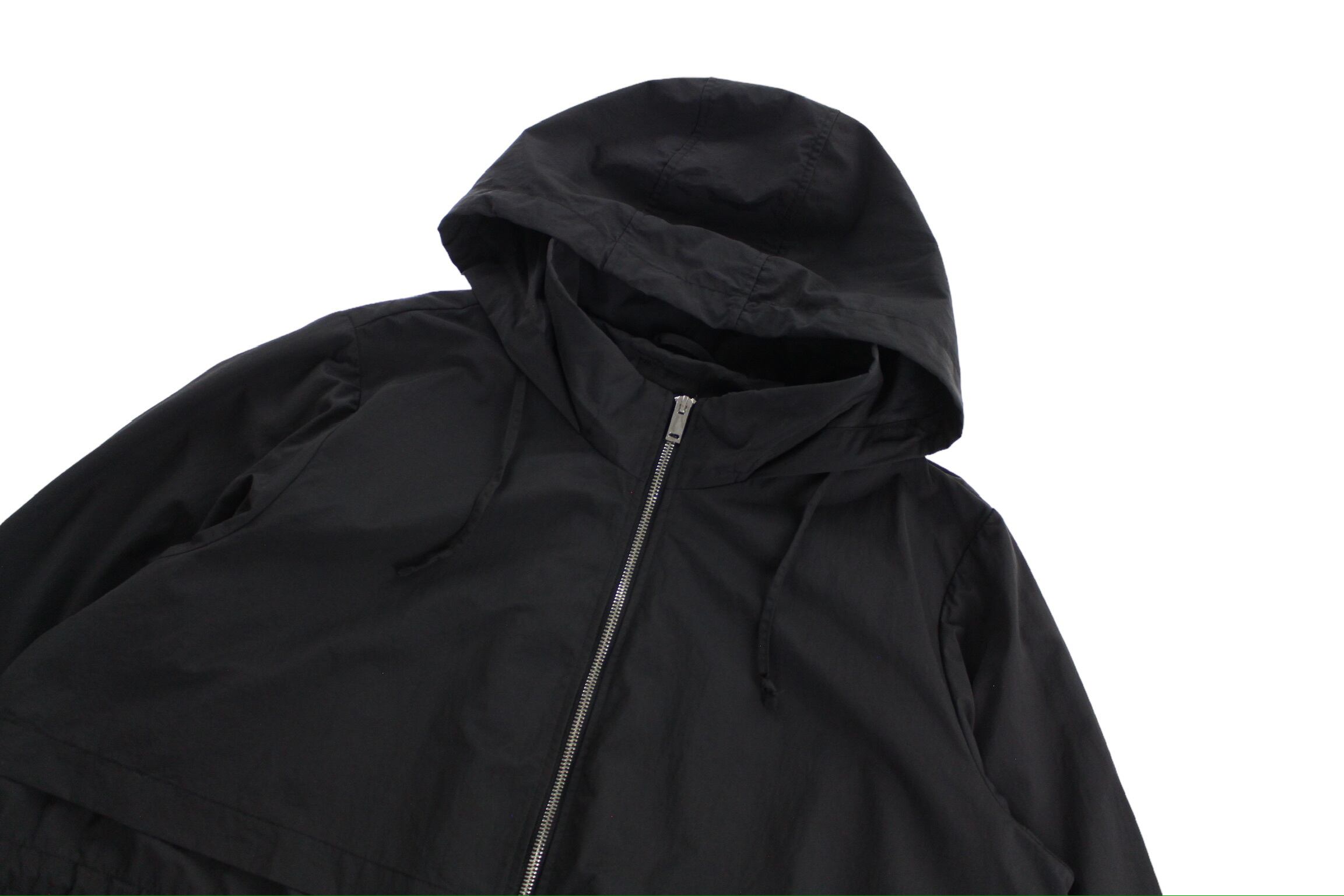 薄手のナイロン生地にギミック盛りだくさんのパーカー。ハイネックデザインの襟はフードを収納することができ2WAYでのスタイリングが可能。ボディにはドローコードが付き気分によってシルエットに変化をつけることも◎