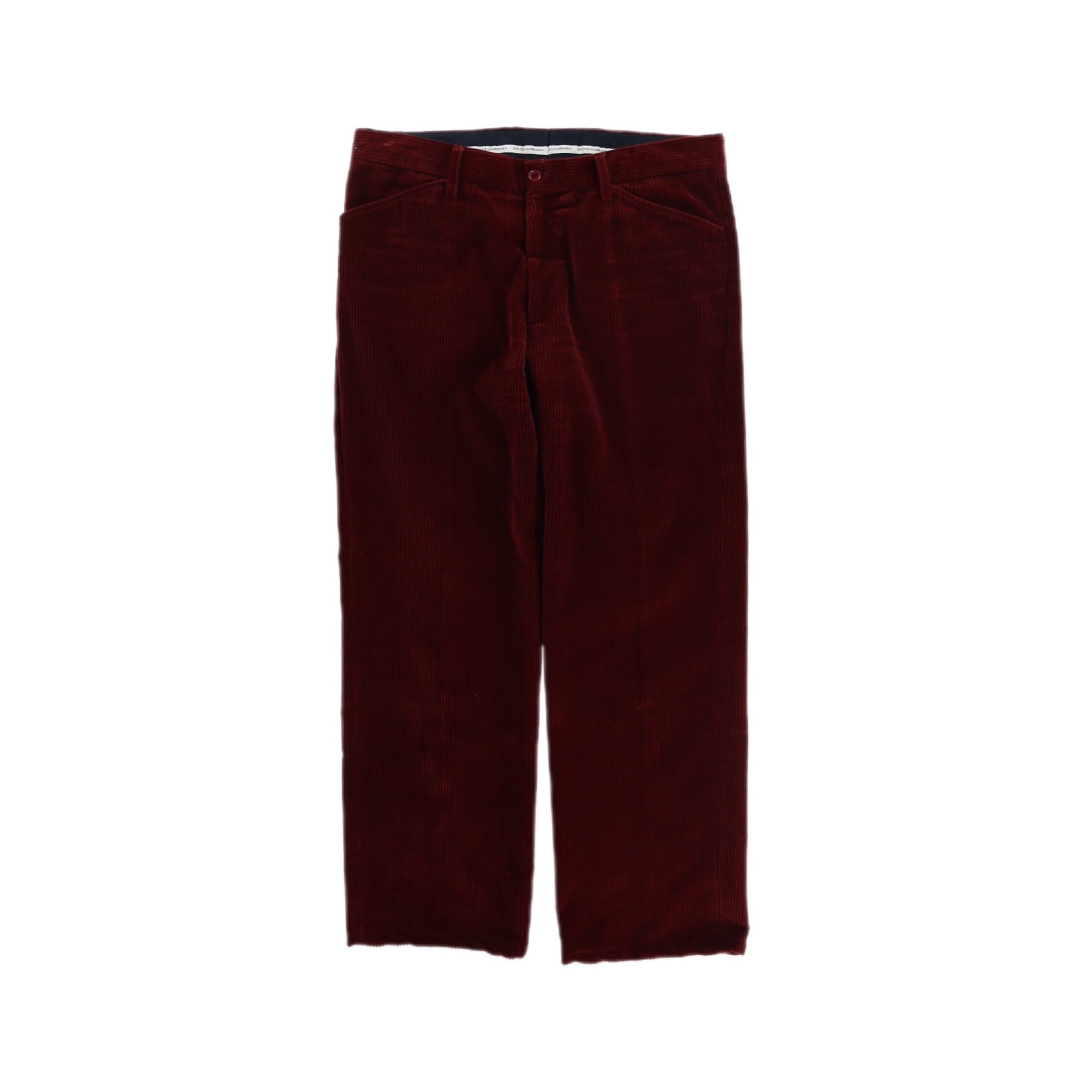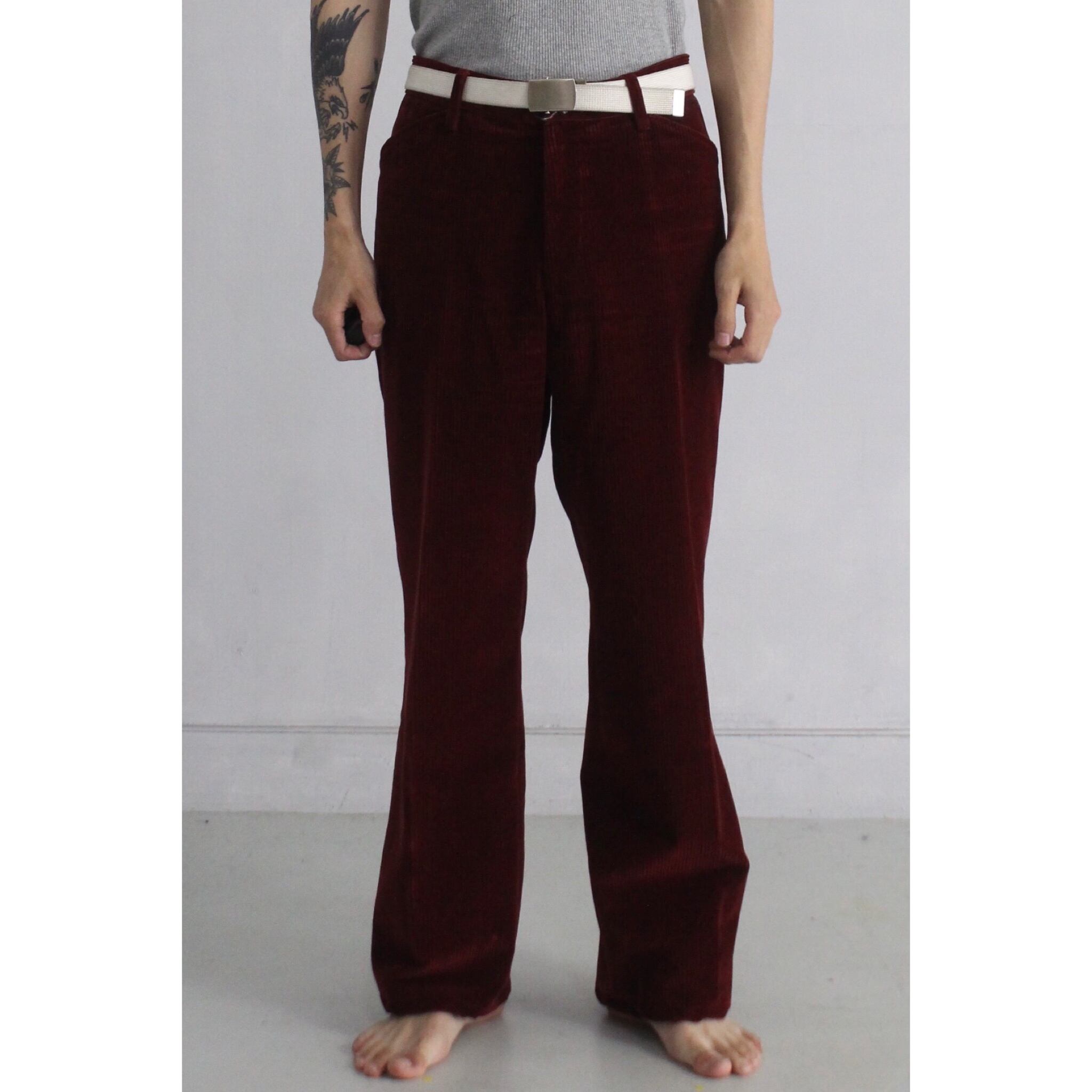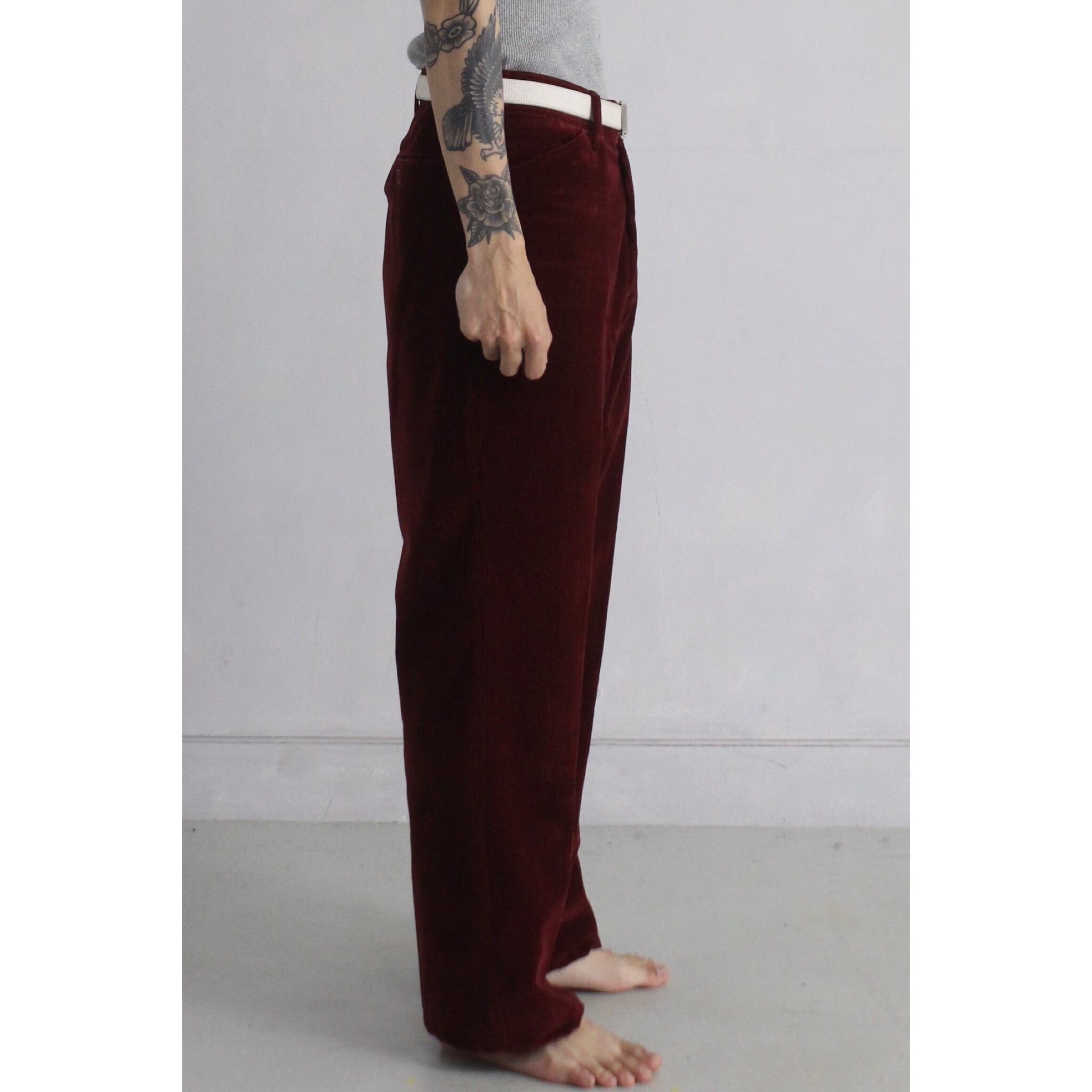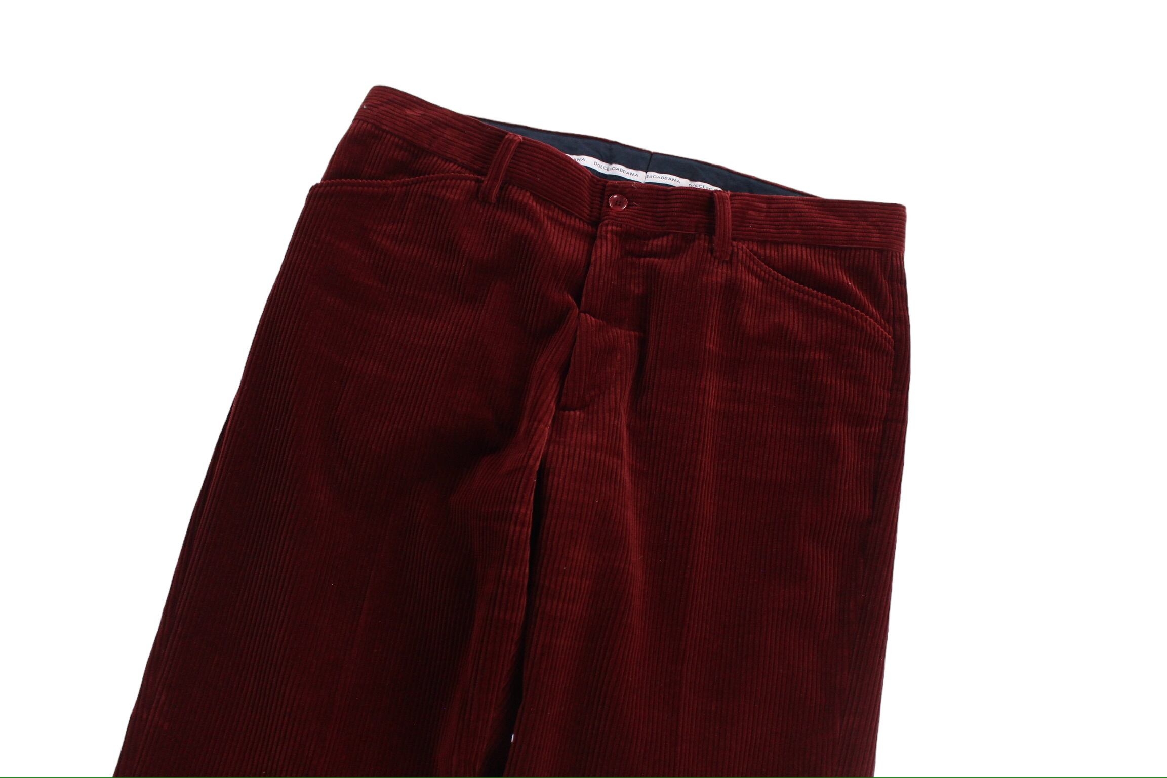イタリアらしい上品なワインレッドカラーにコーデュロイパンツでは珍しいズドンとワイドに落ちるストレートシルエット。コーデュロイはテーパードの物が多いのでここまで太いのは稀。