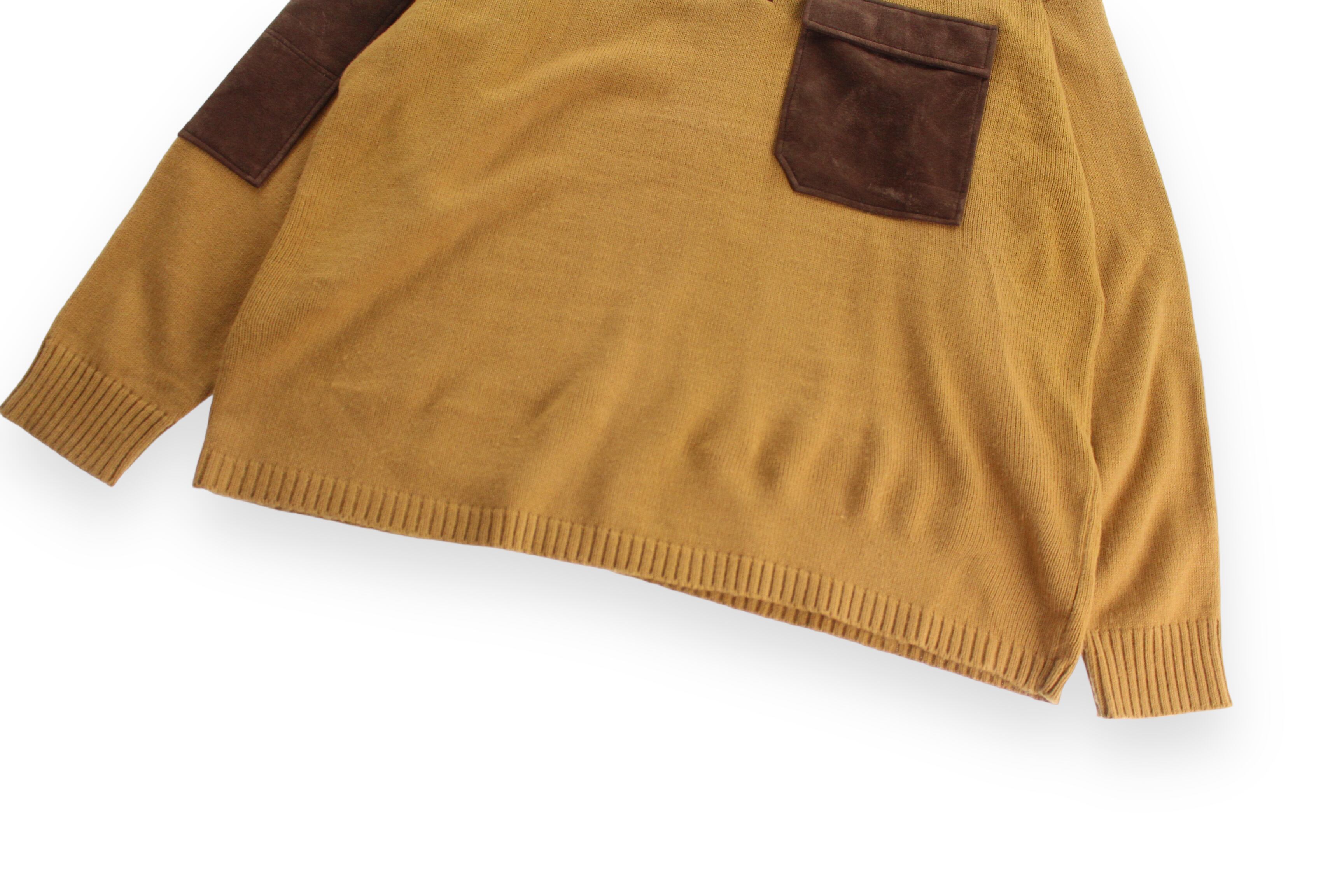 マスタードボディにブラウンのフェイクスエードのポケットがデザインされたとっても可愛いニット。