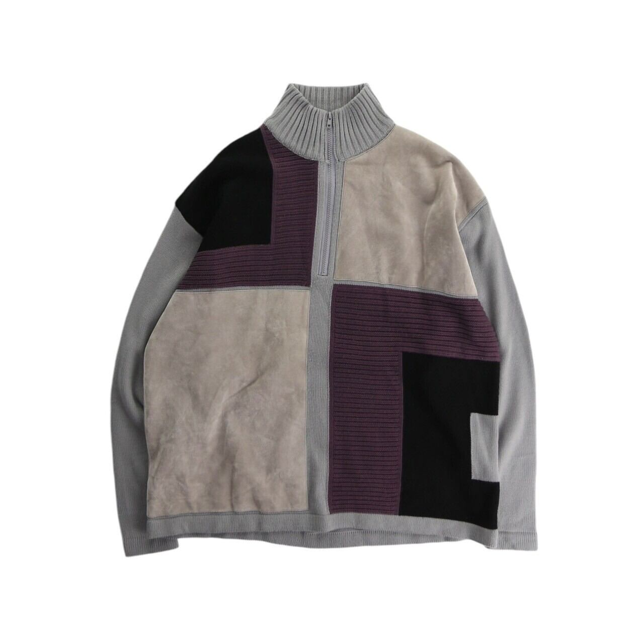 前面だけパネル切替でパネル部分はフェイクスウェード、畦編みで素材も変わっております。色使いもすごくセンスが良く1枚で可愛いニット。