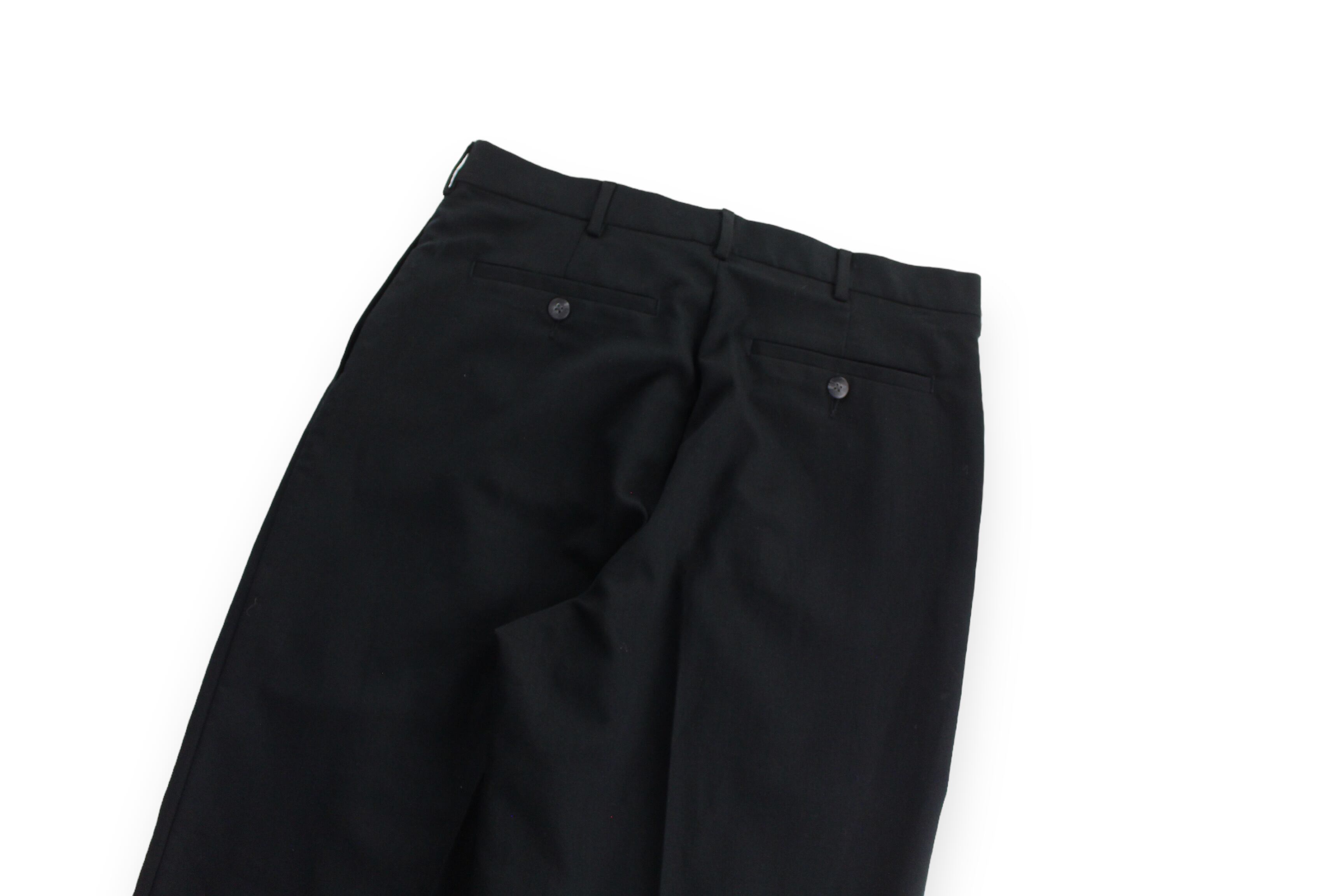 控えめなテーパードのストレート感覚に履けるシルエットで汎用性抜群。1着はマストで持っておきたい黒の良いスラックスです。
