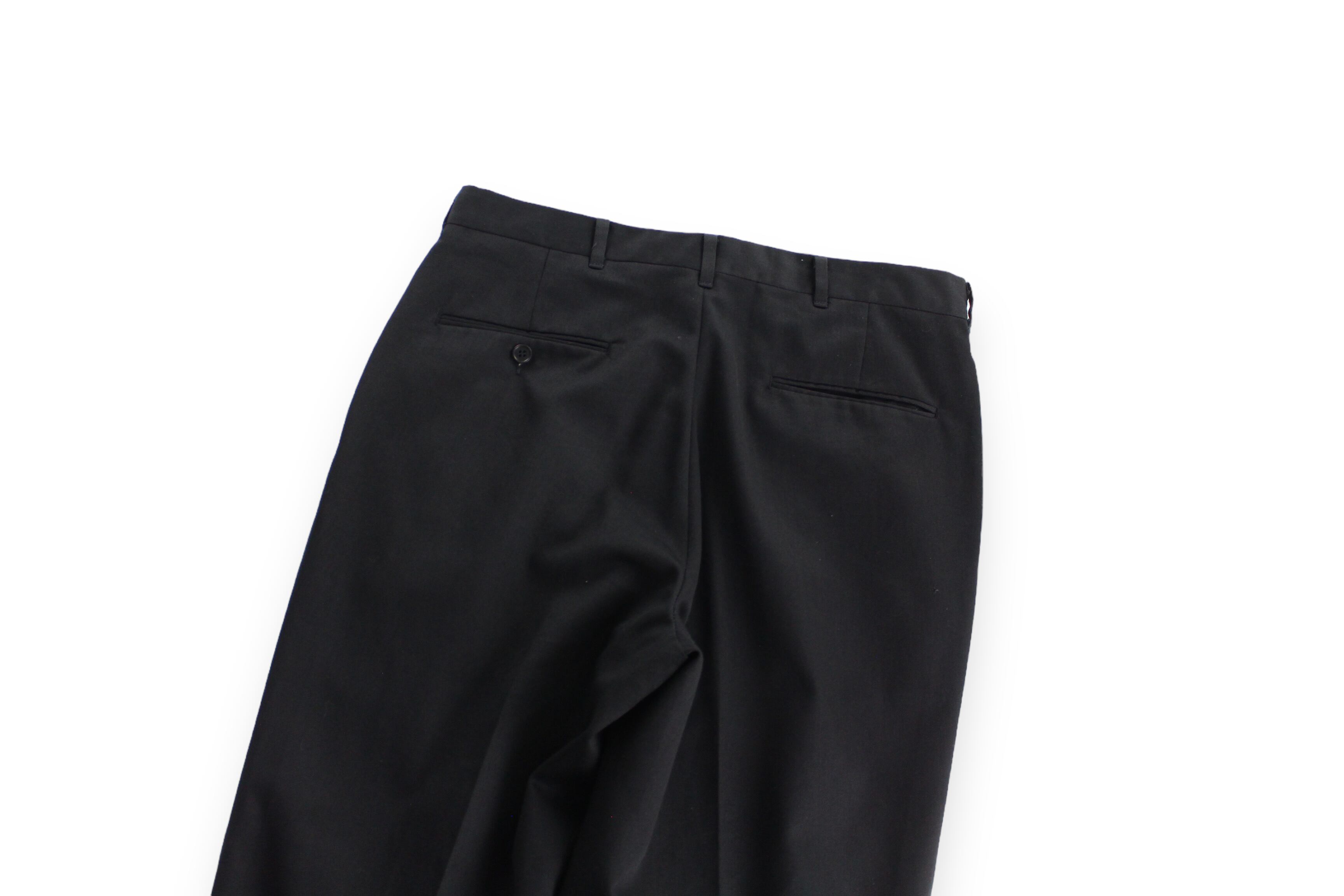 ファブリックはとろみがありつつもコシのある高密度なギャバジン織りの生地感。メゾンブランドなどにも採用されるタフな生地感です。スラックス本来のドレスな雰囲気は残しつつもデイリーにも使い勝手の良い柔らかさのあるファブリックです。