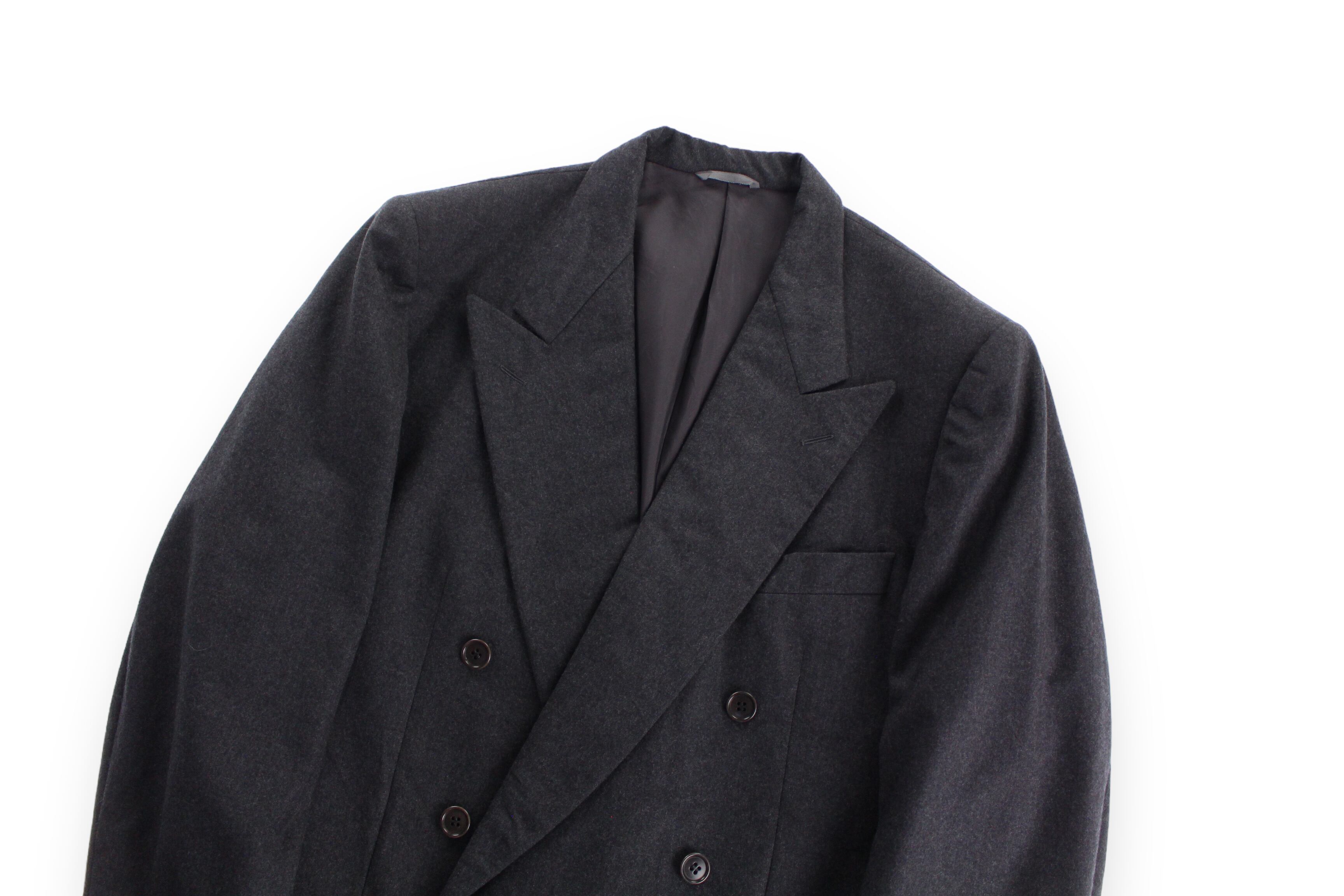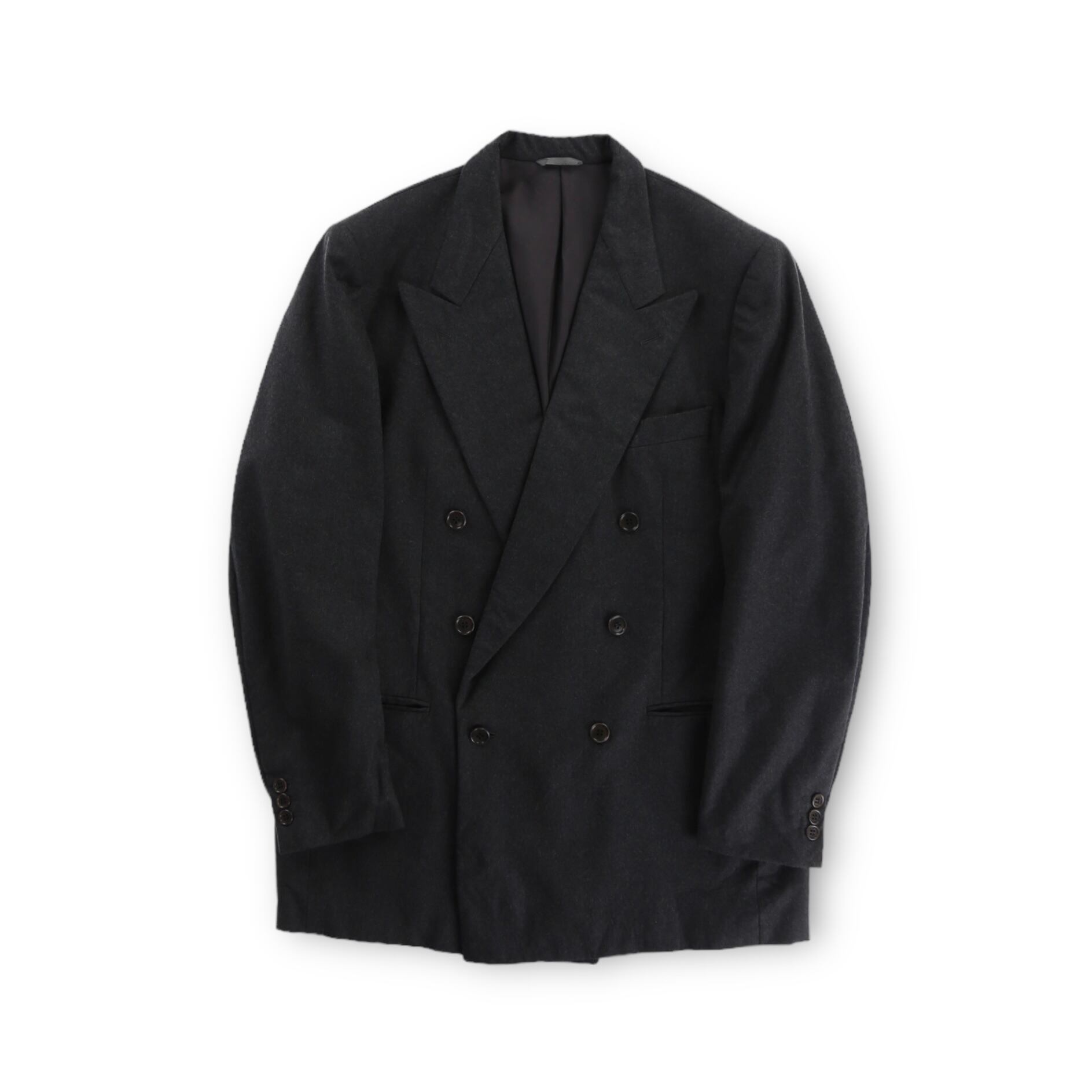人気なダブルブレストにピークドラペルのかっこよさが際立ちつつもレトロでクラシック感のあるダークグレーカラーとフワッとしたファブリックの1着です。