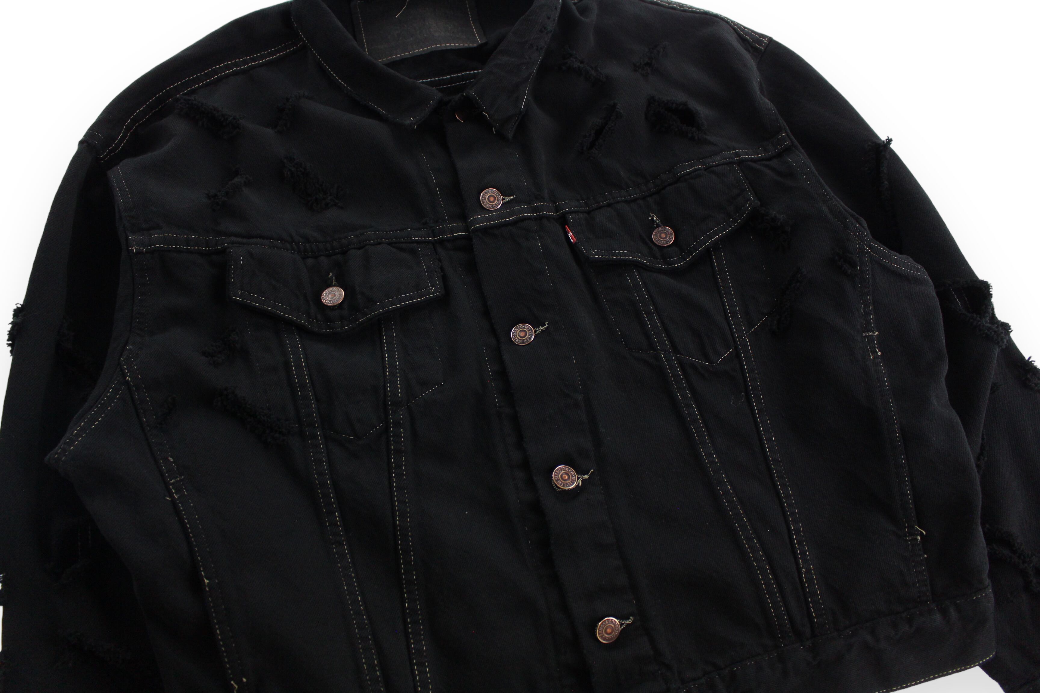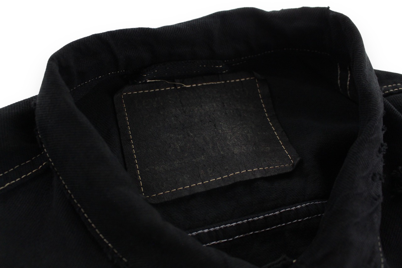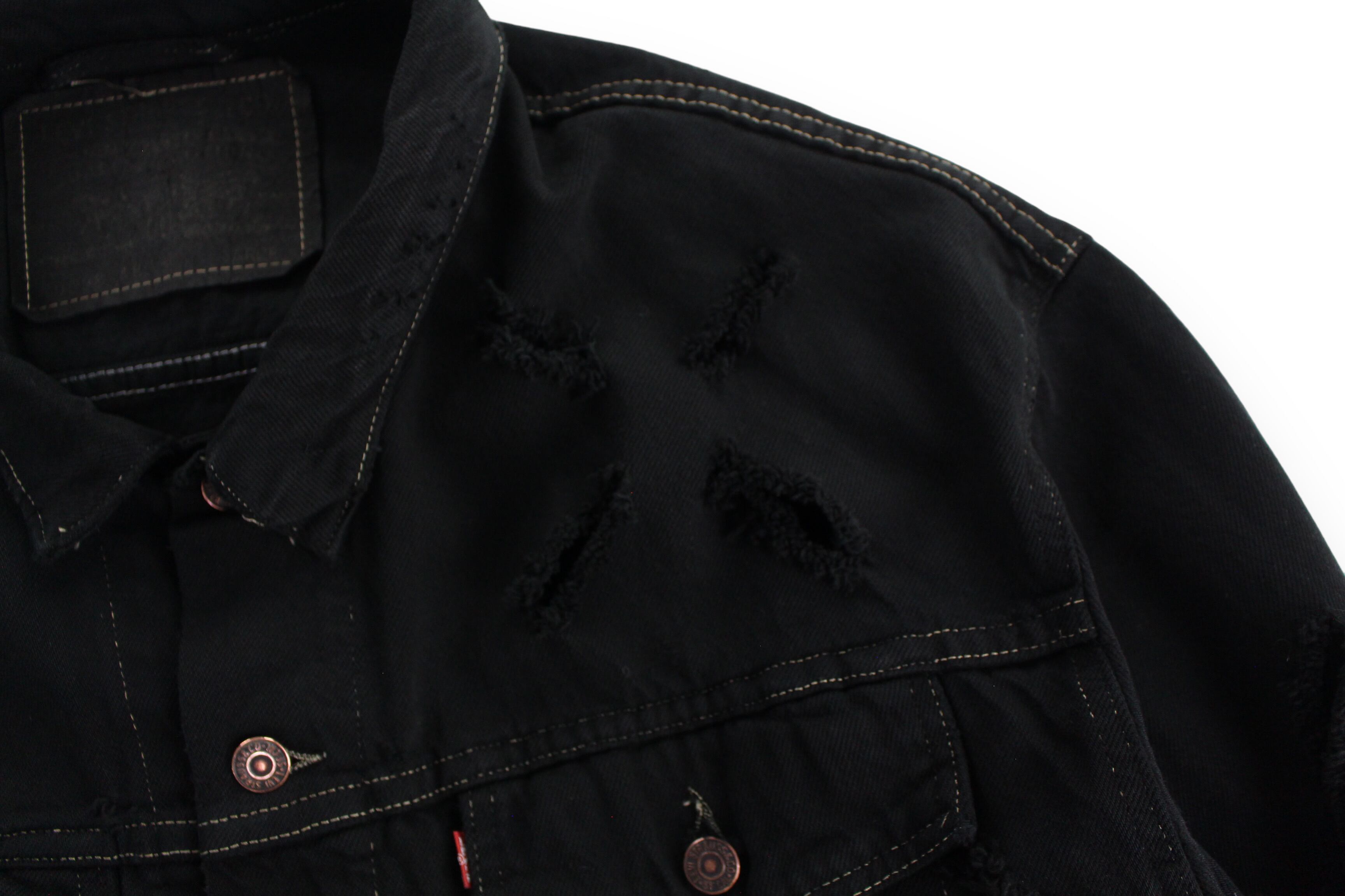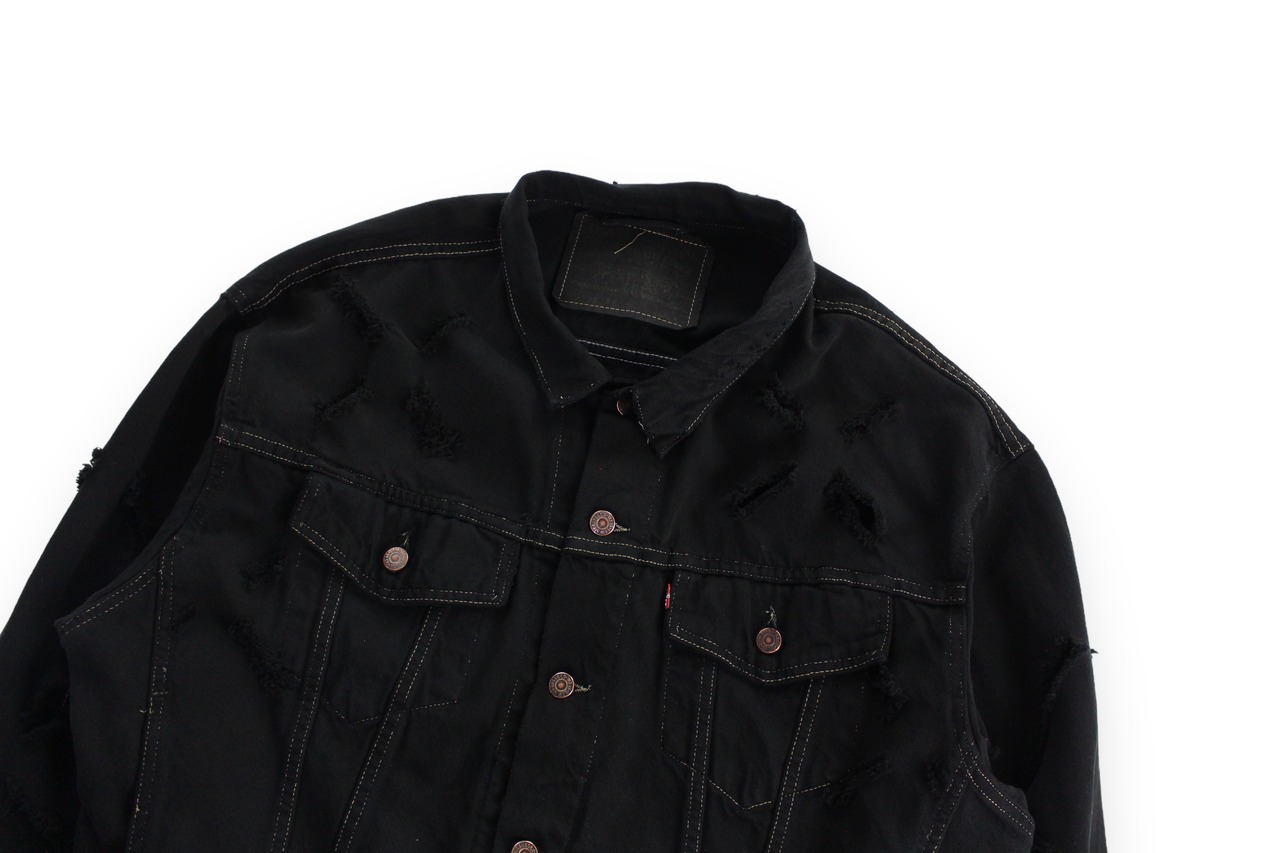 リーバイスのブラックデニムトラッカージャケットです。ハイブランドのような袖や背面に施された某ブランドの四つ糸タグのような形のクラッシュディテール。作り手の手の込みようが凄く、感心しますこのリメイク技術。