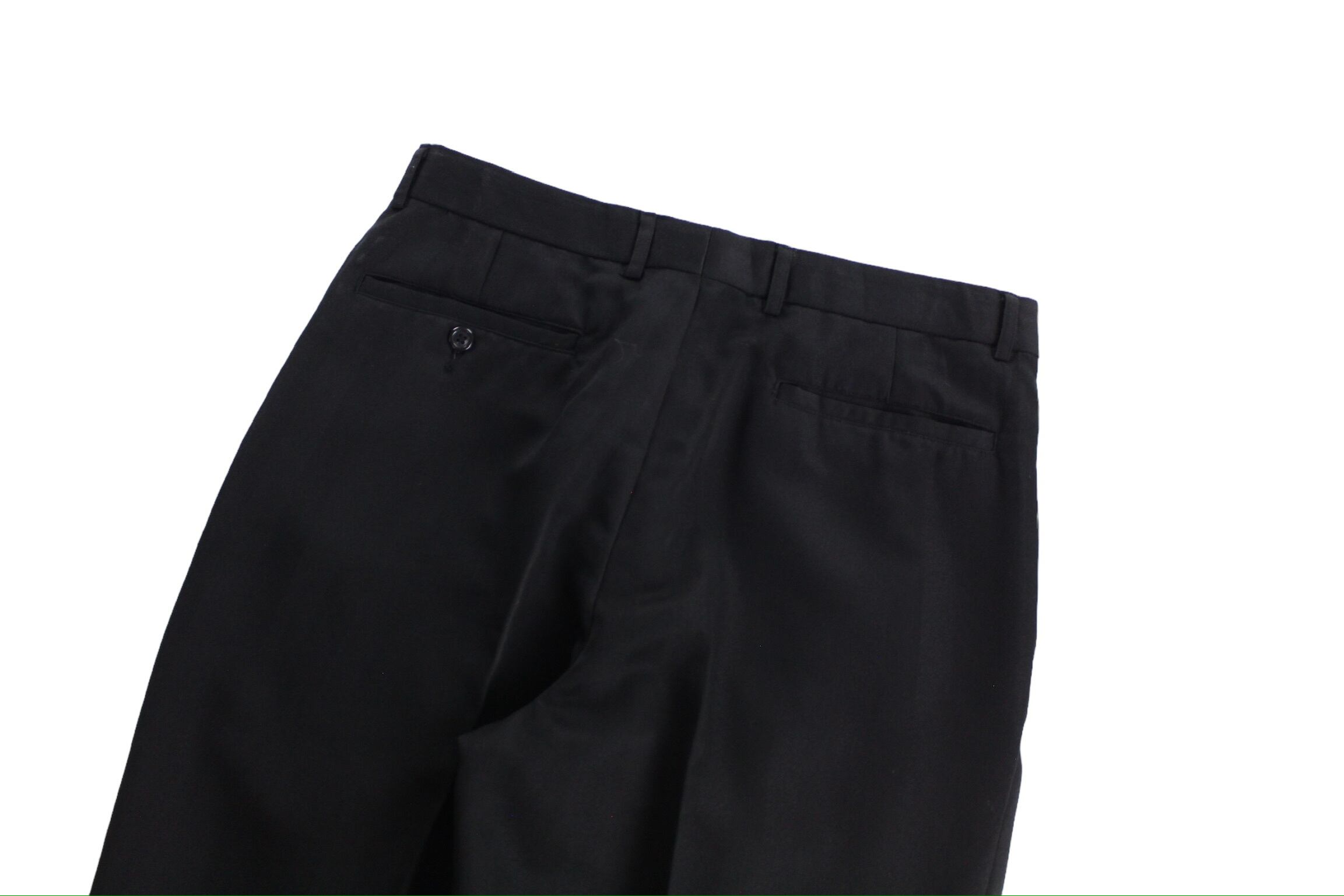 2タックのしっかりと余裕を持ってとられた腿周り。着用した時のシルエットも美しく素材もドレープ感もある綺麗なスラックス。テーパードながらも腿周りの太さ相まってストンっと落ちるワイドなシルエット。ポリエステルの通年着用可能な生地も嬉しく,シルエットが存分に活かせるファブリックで組み合わせとしては満点。