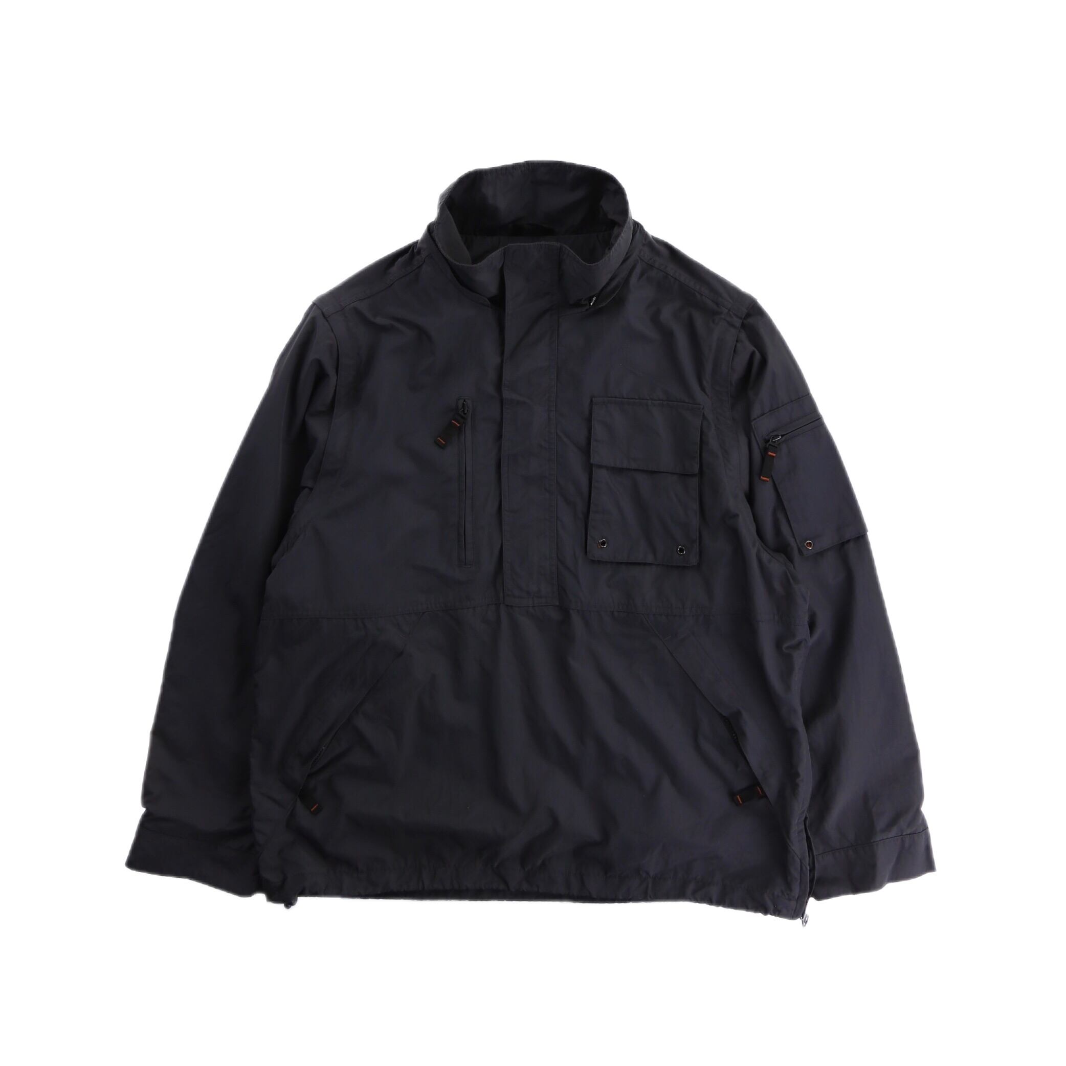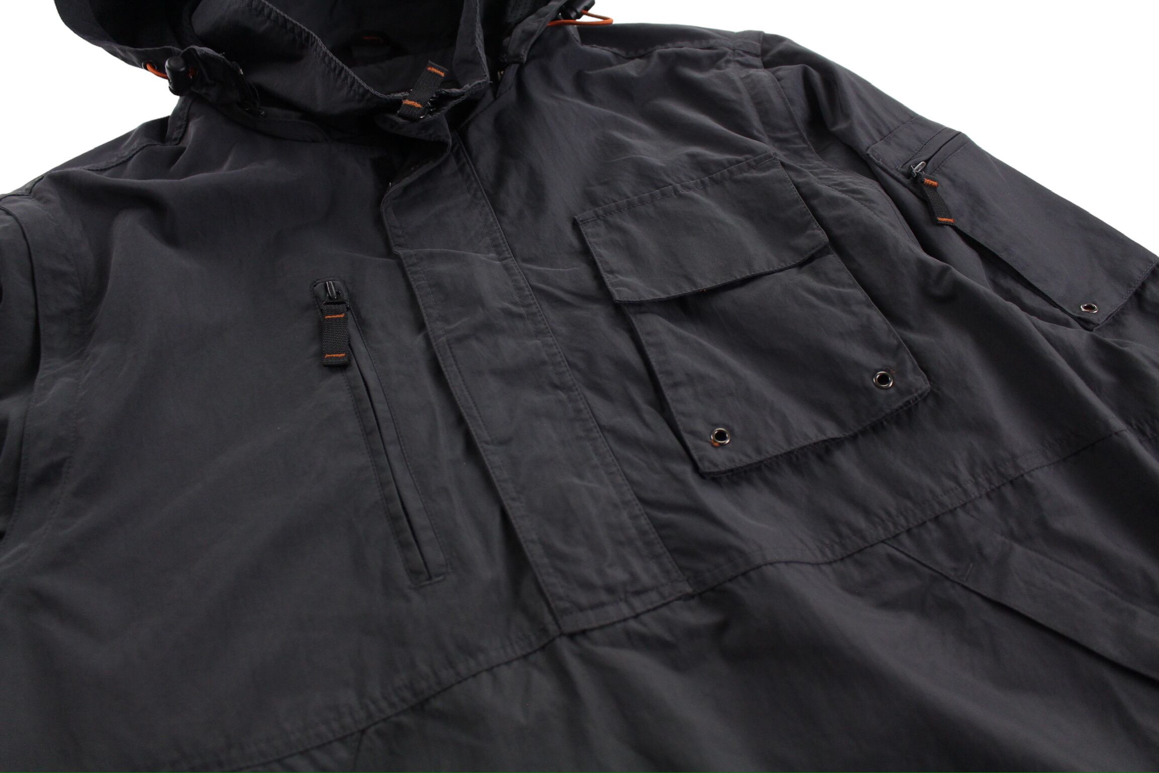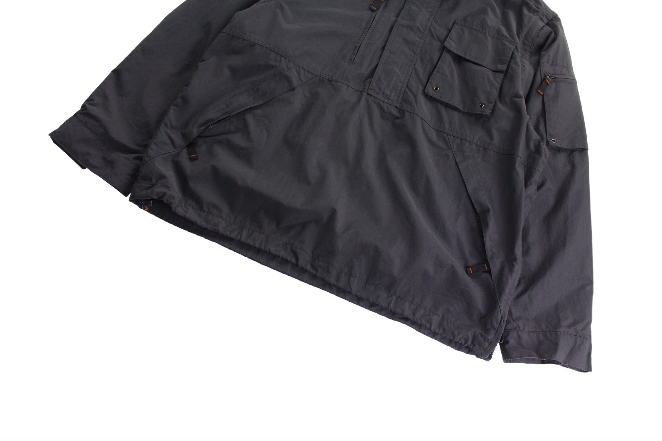 ナイロン系のアイテムでは珍しい都会的なチャコールのボディに裏地は原色すぎないダークなオレンジ。恐ろしく好配色。アノラック仕様でガバッと羽織れ,随所に施されたポケットの数々。ナイロン素材で悪天候にも対応し機能性抜群な1着。
