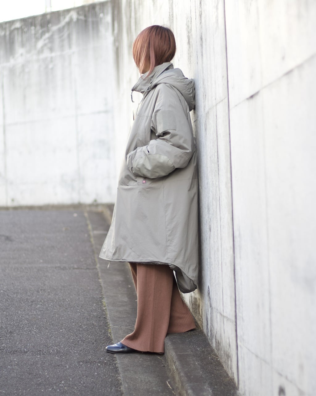 無駄なデザインの無いシンプルな見た目に丸みを帯びたボリュームのあるシルエット、フードは被っても違和感のない大きなサイズ感且つ、収納したままでも、出したままでもサマになる見た目。(中々フード収納可のアウターでどちらの状態でも格好の良い物は多くはないだろう)