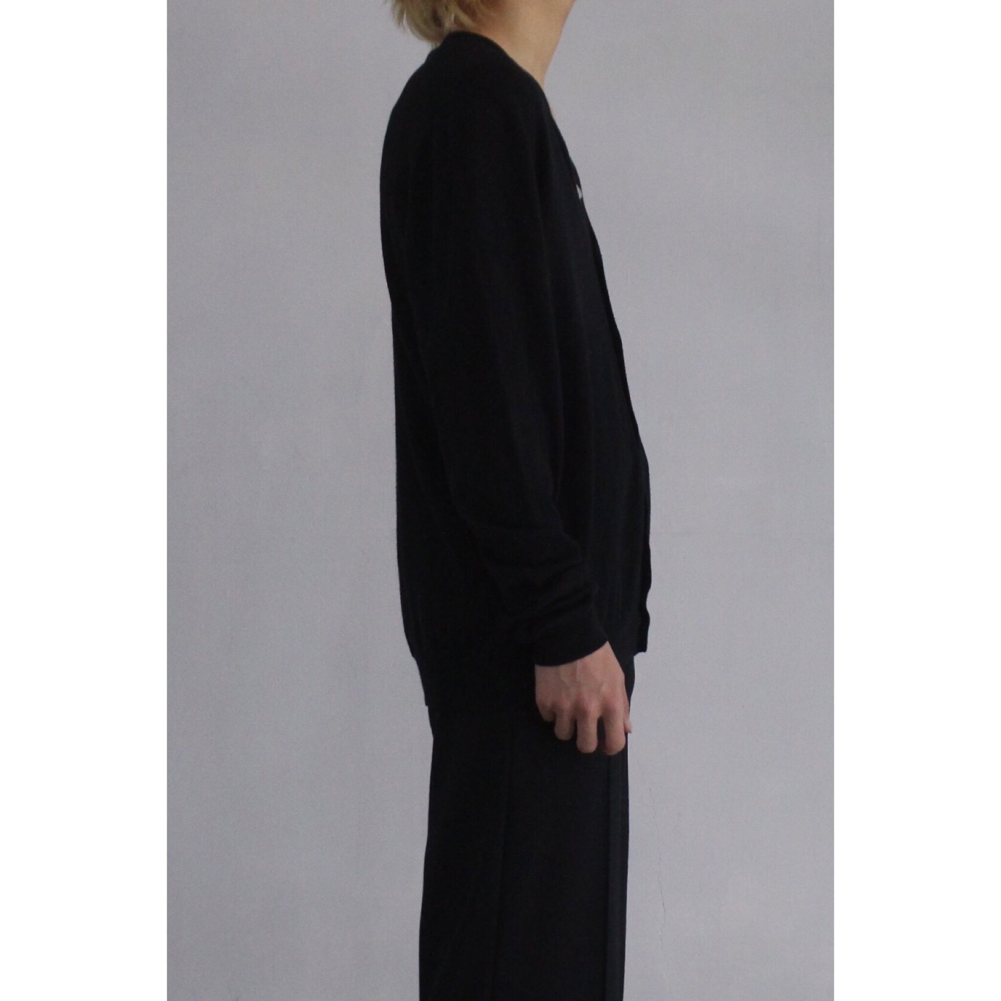 チクチクしない柔らかなハイゲージに編まれたウール100%のボディにマットな質感のブラックボタン。オールブラックで統一されたブランドらしいラグジュアリーなアイテム。