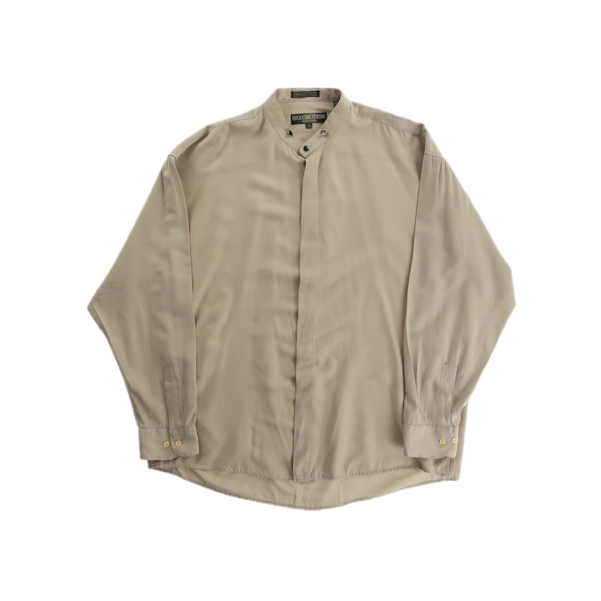 ベージュカラーのバンドカラーシャツ。