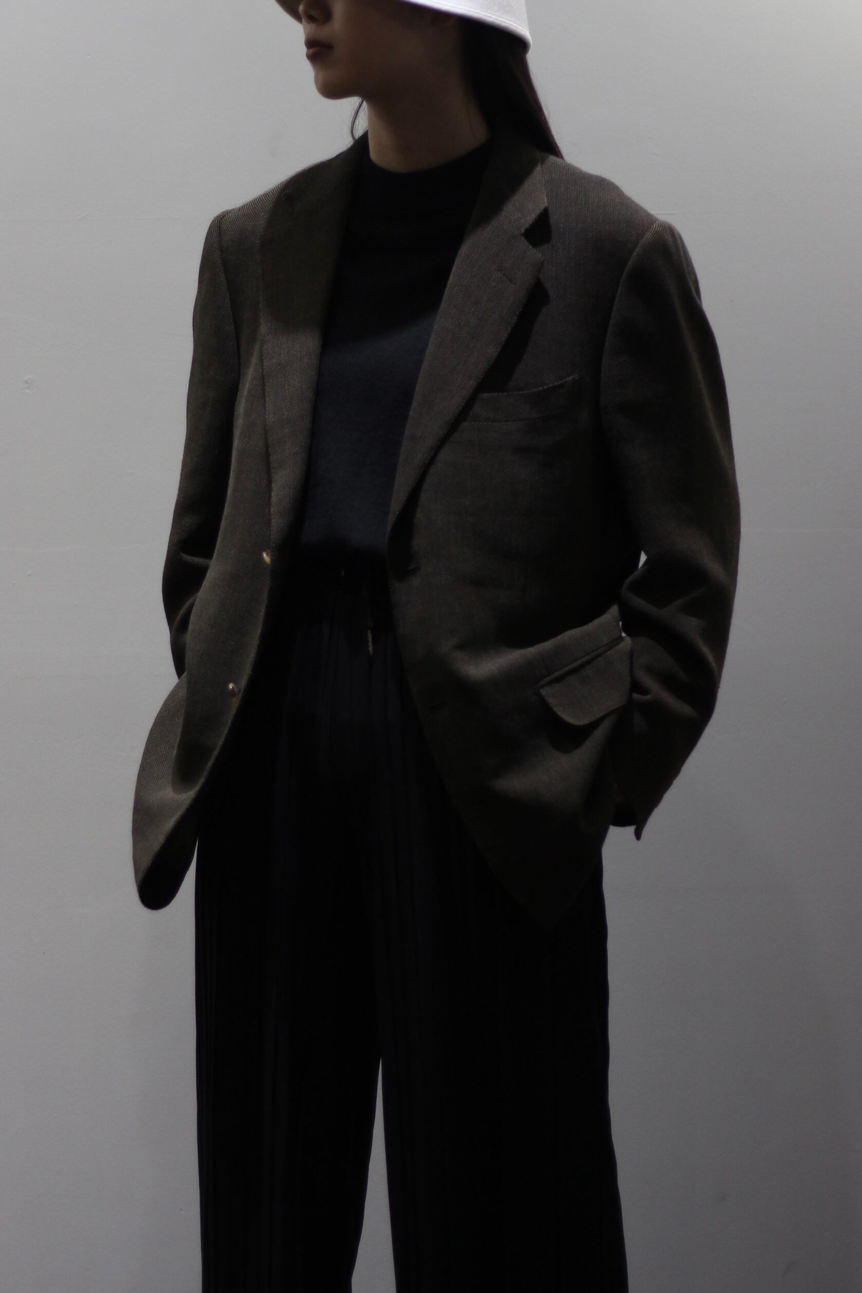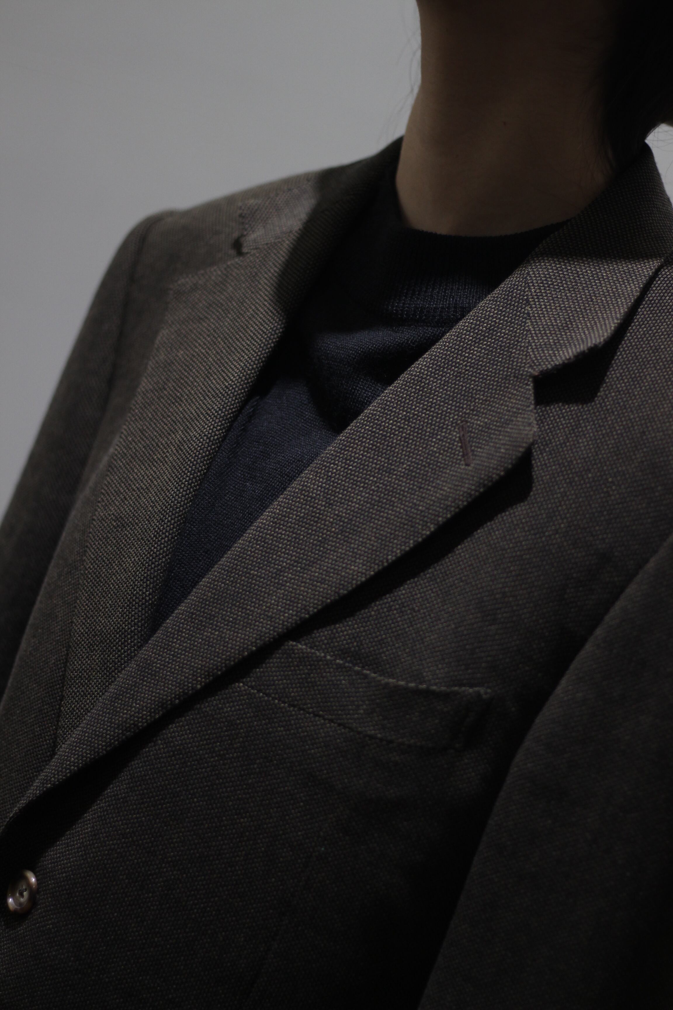 アルマーニを彷彿とさせるあえて高密度で編まないドレープ感、とろみのある茶黒の糸を混ぜたメランジカラーのファブリック。