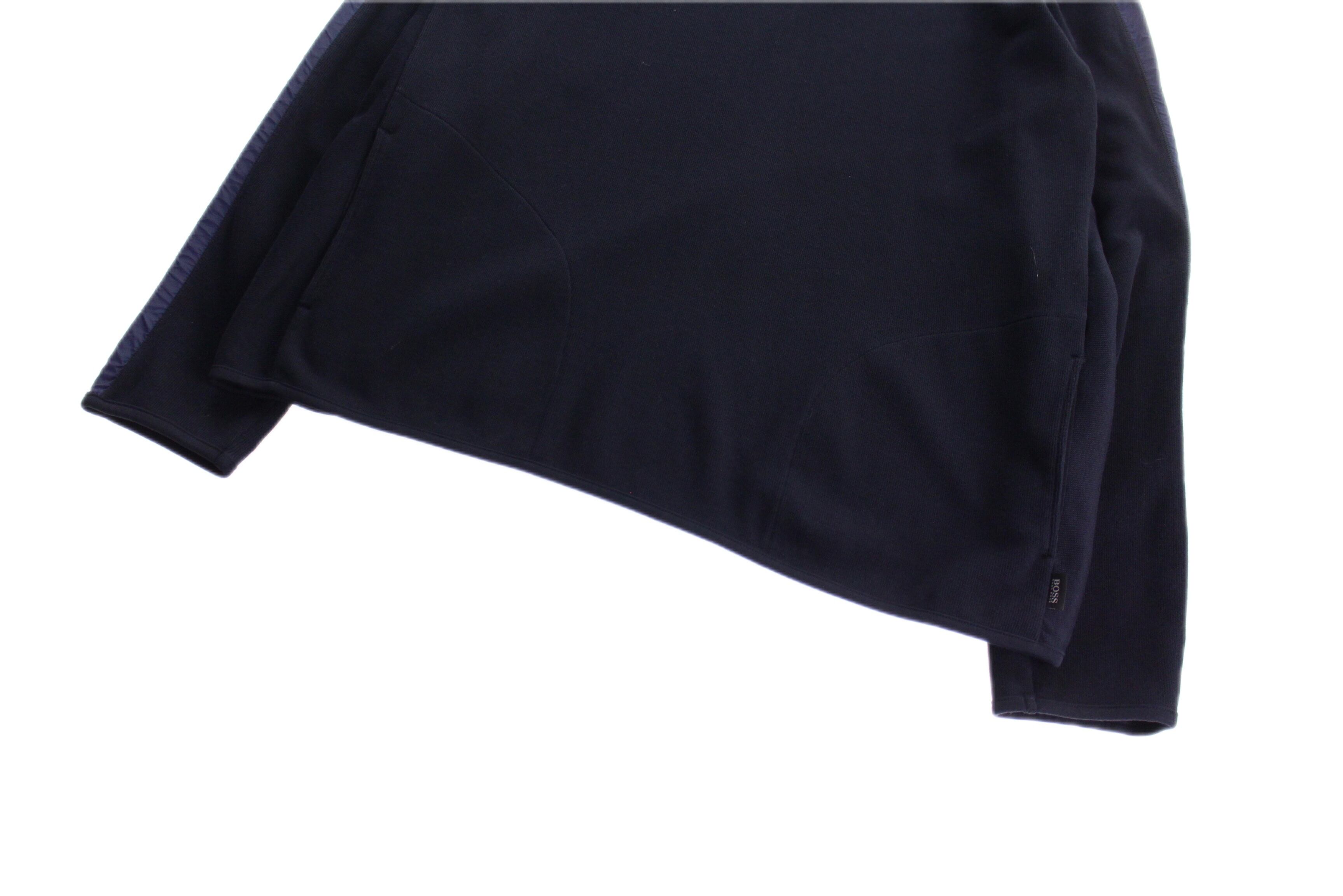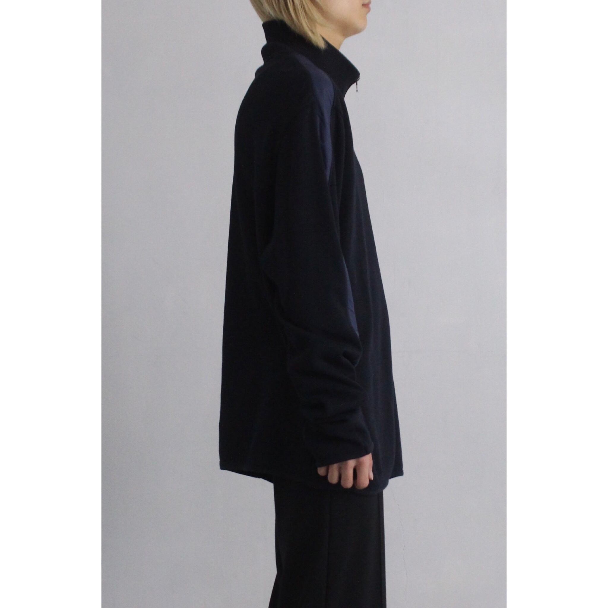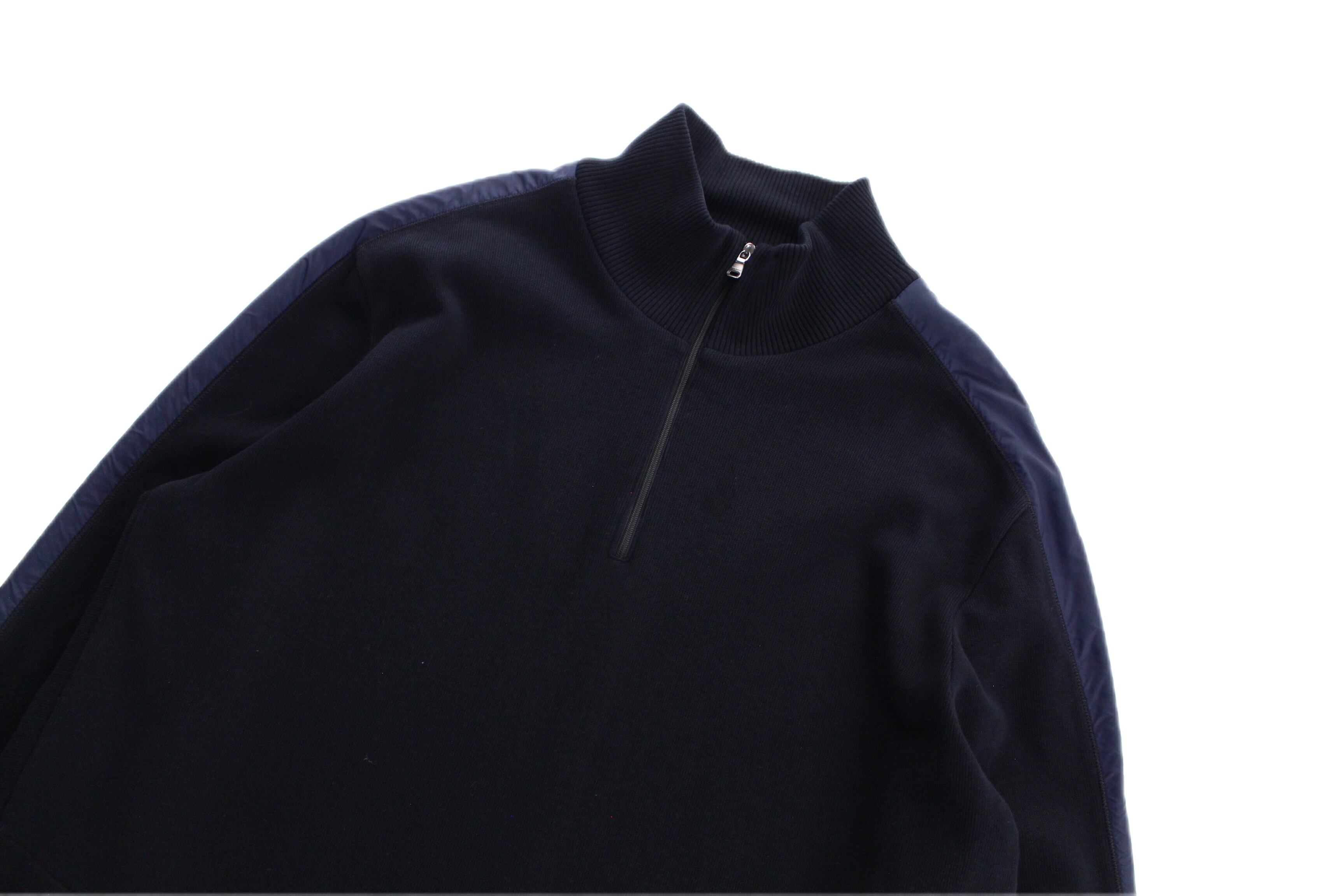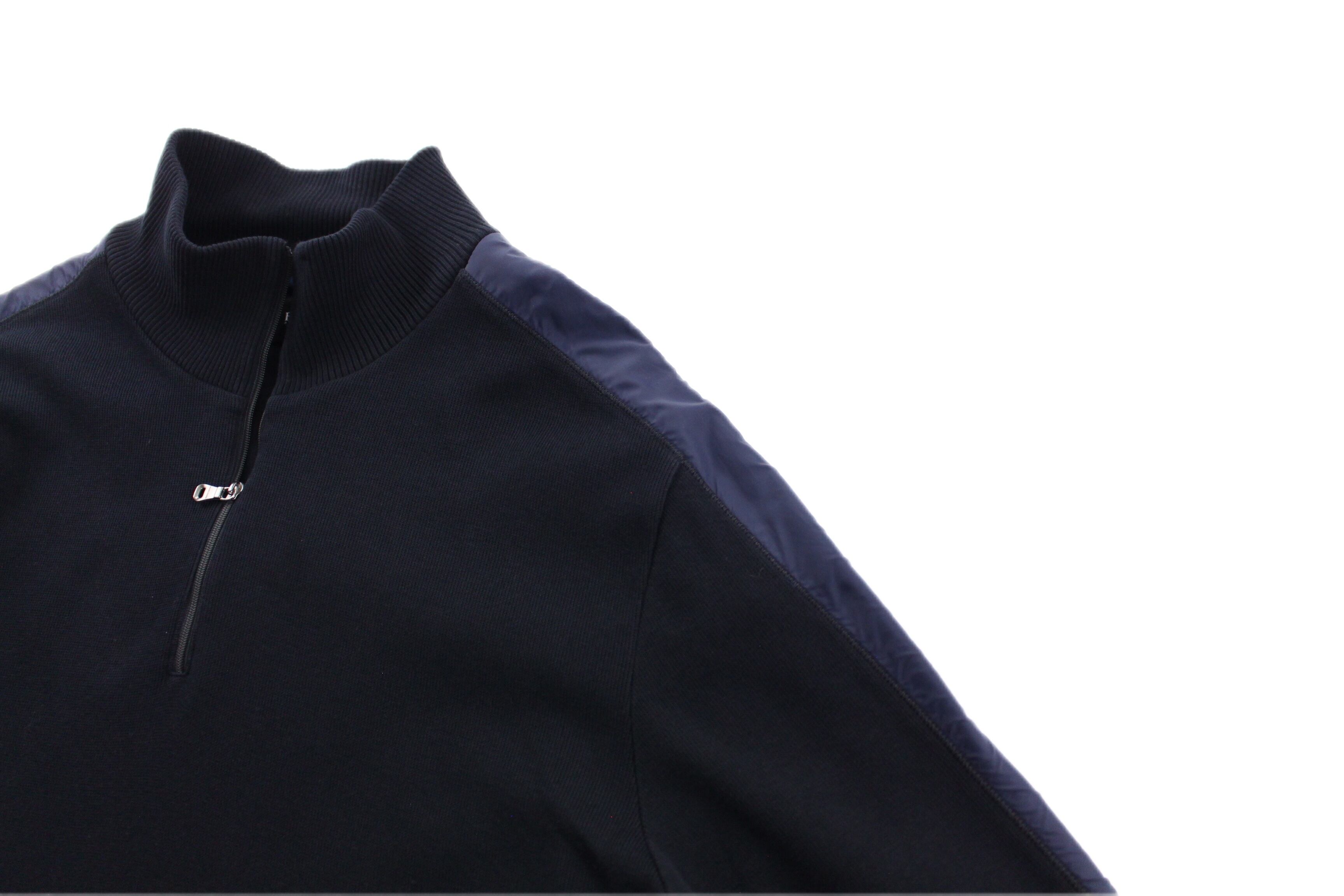 定番のハーフジップに肩から袖にかけてナイロンの切替アームラインに高めなネックのデザイン。フロントにはポケットが付きシンプルながらもデザインが効いた1着。