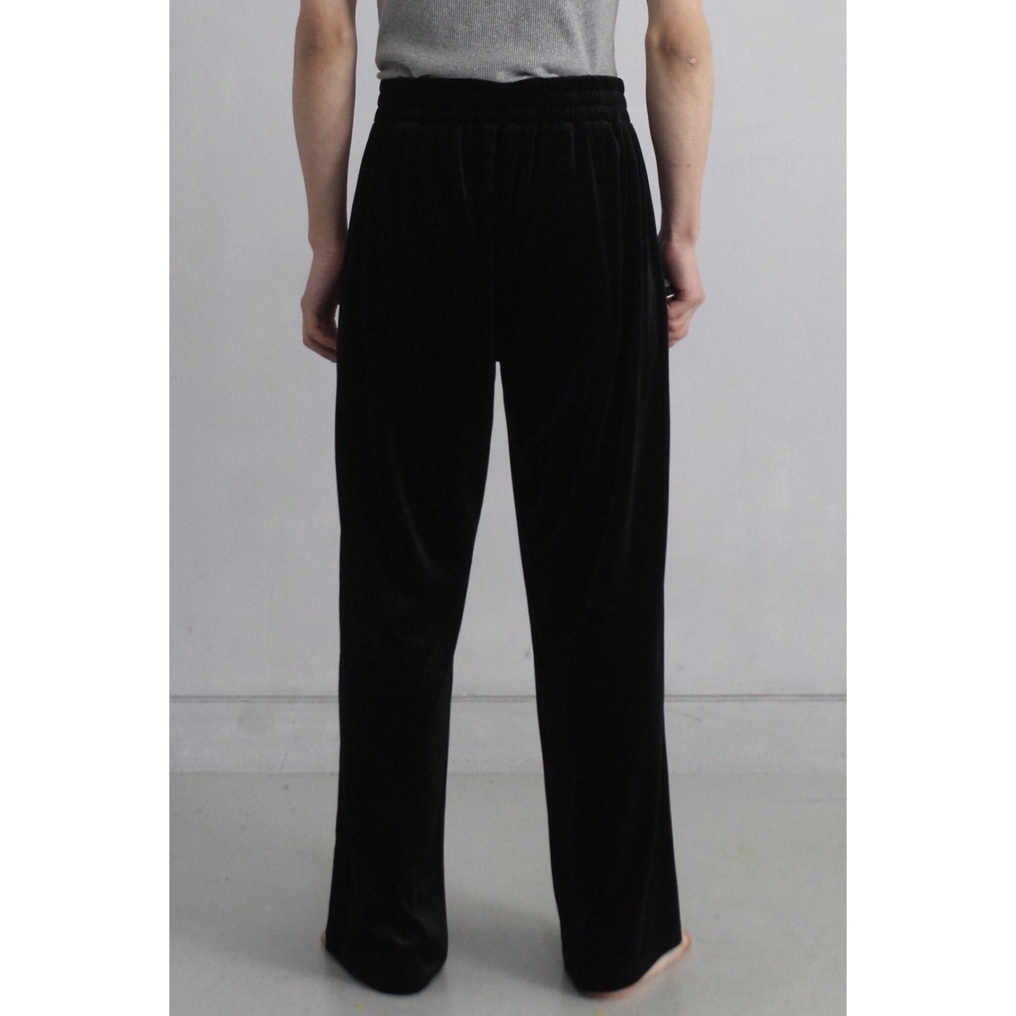 ベロア特有の光沢のある生地にブラックカラー。無地ながらもその光沢感から高級感溢れる1着。品のあるラフすぎないイージーパンツです。ウエストゴムでサイズ表記Lのあらゆる方におすすめできるゴールデンサイズ。