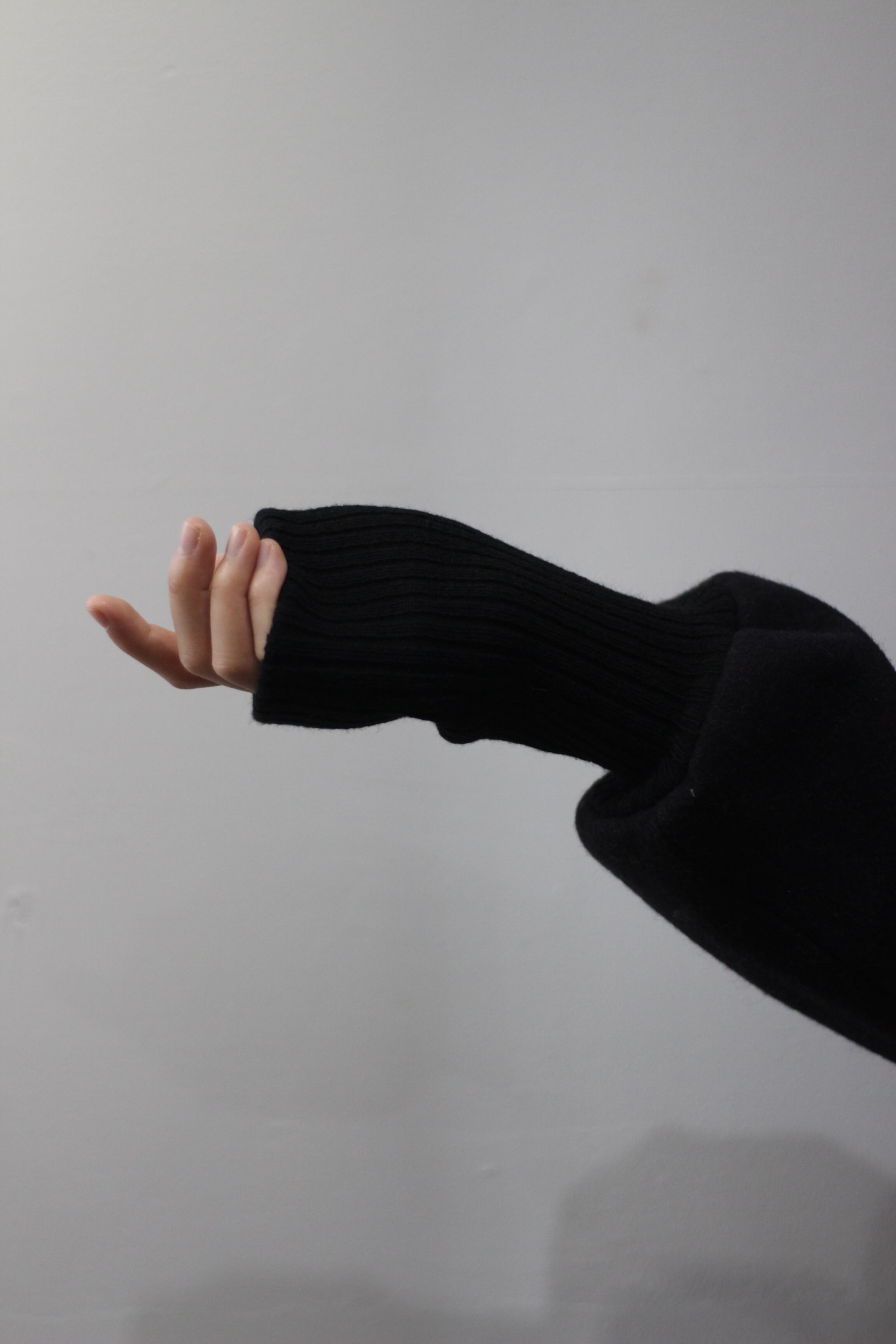 アームウォーマーをしているような印象でたっぷりとしたアームのボリュームからシュッと袖先にかけてコントラストの出る形。折り返しても可愛いです。