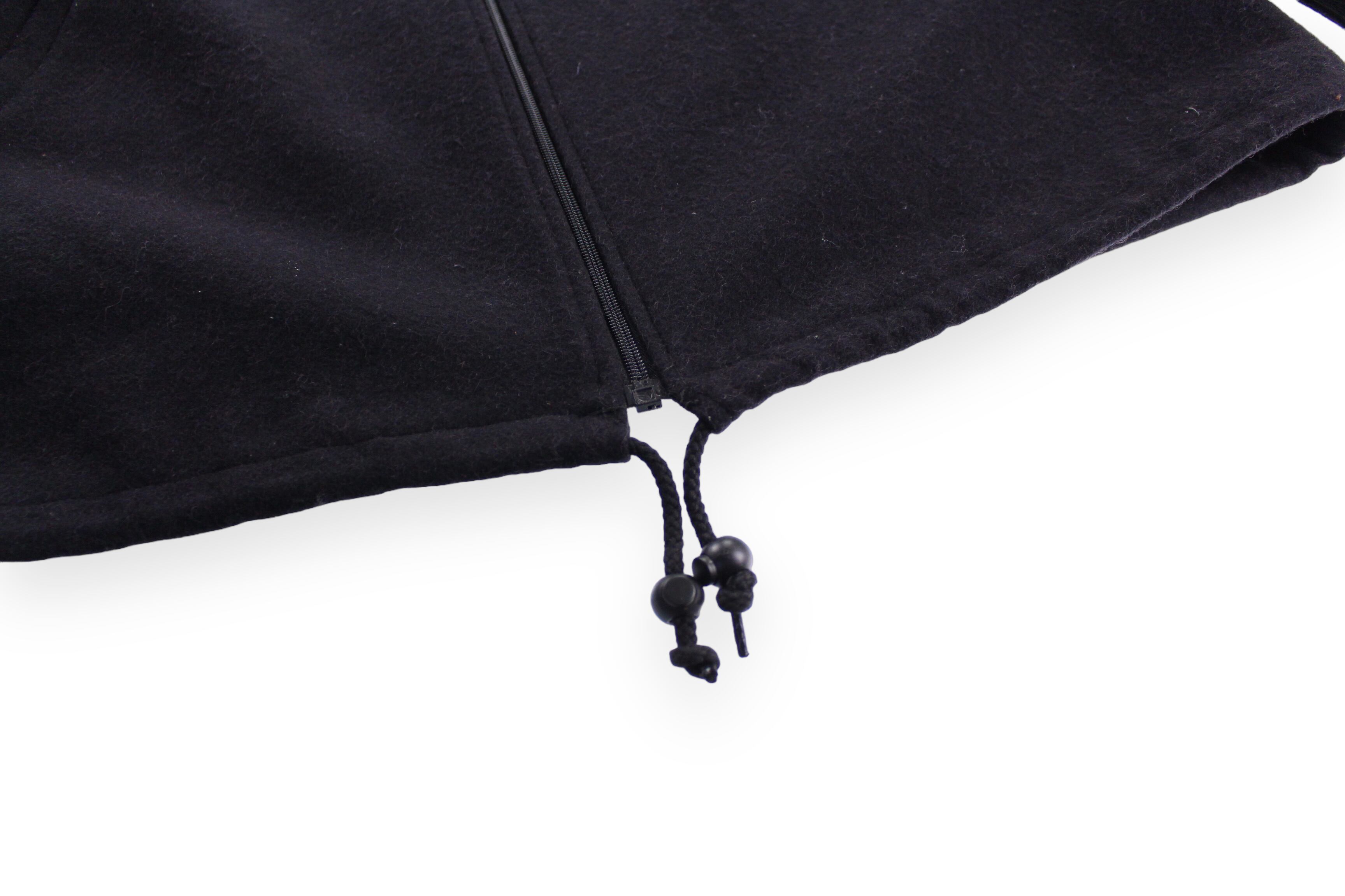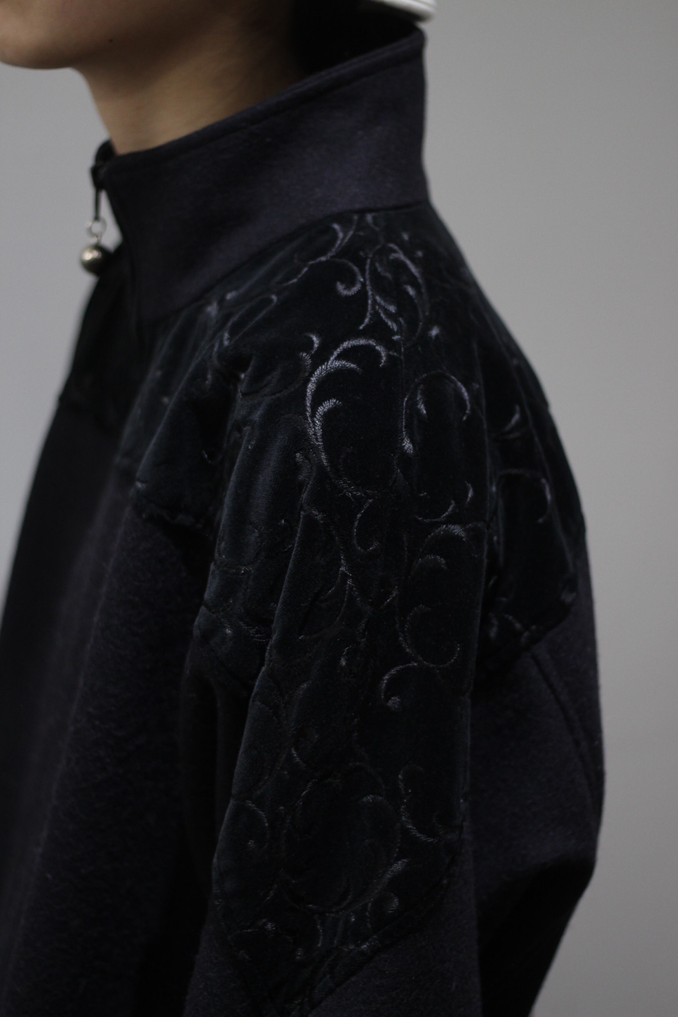 柄の入ったショルダーのベロアスイッチングに上質なメルトンウールファブリックのボディ。旬なハイネックに裾はドローコード付きでシルエットも丸みを出せるディテールになっています。