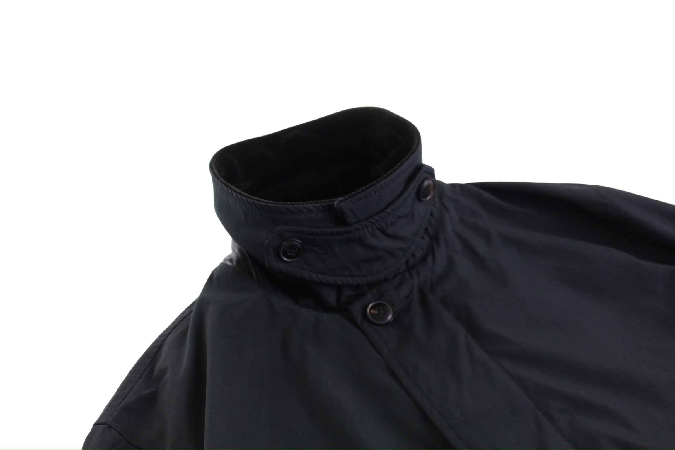 ナイロンにも似た滑らかで柔らかいポリエステル地に,目を惹く襟元のコーズデザイン。立ち襟にも可能なチンスト付きでお探しの方も多い個体。フロントはジップ×ボタンの二重構造でジップはダブルジップ仕様。随所に施されたラムレザーパイピングはシンプルながらもデザインの効いたラルフらしい1着。