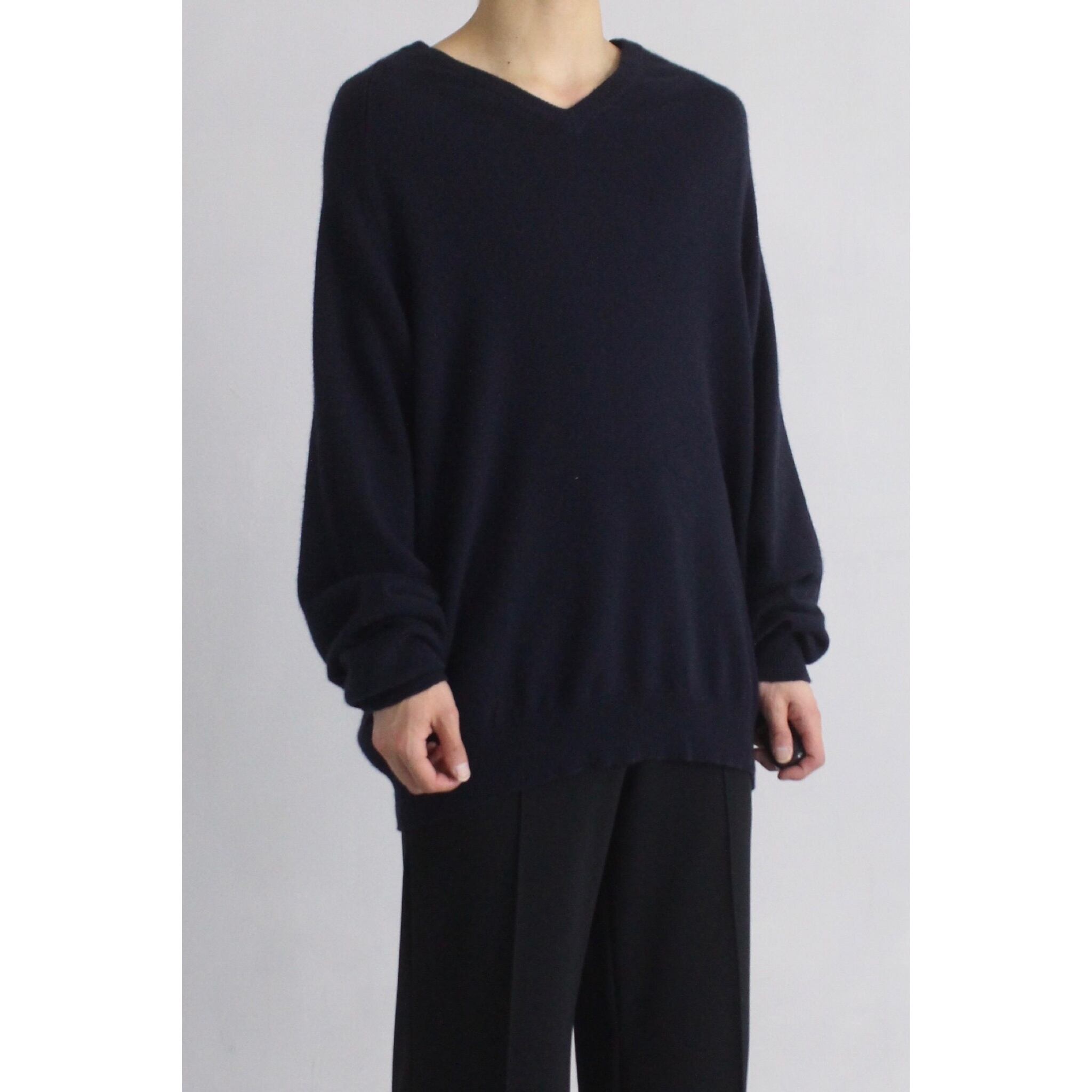 ダークネイビーの上品なカラーリングでほぼブラック同様な汎用性の高さ。抜け感の出るVネックデザインはそのまま肌を見せても良いしシャツを仕込むのも可愛い。究極に無駄のない洗練されたなデザイン。