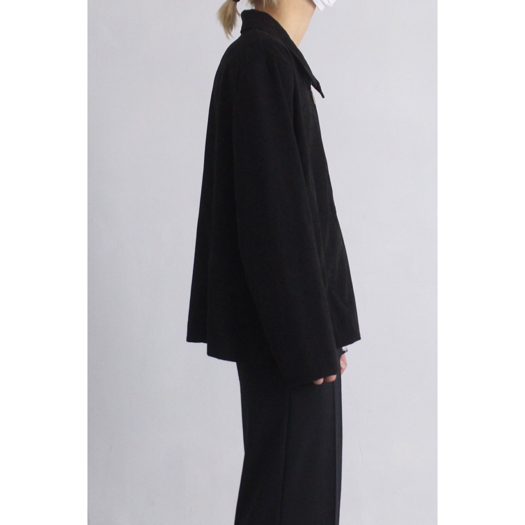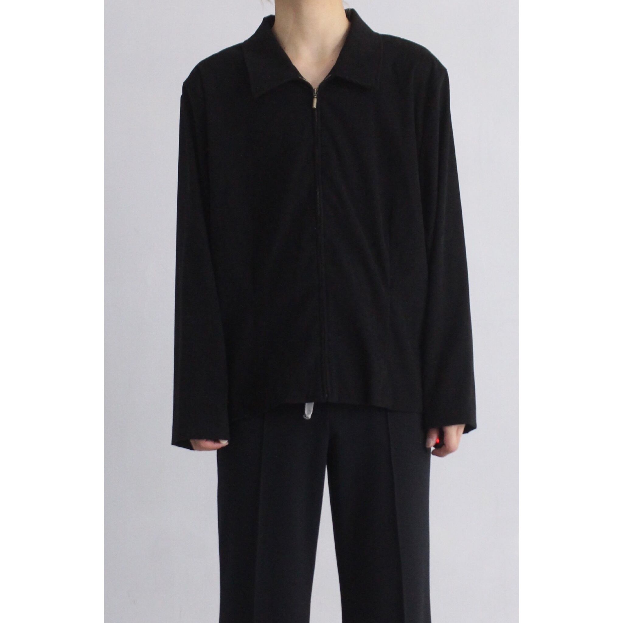 素材は薄手で滑らかなフェイクスエード生地。トロトロなファブリックで,とてもモダンでラグジュアリーな佇まいです。裾も袖にも一切絞りがない綺麗なボックスシルエット。フロントジップアップのシンプルで無駄のないジャケット。ブラックに映えるゴールド棒ジップも雰囲気が出て良い。