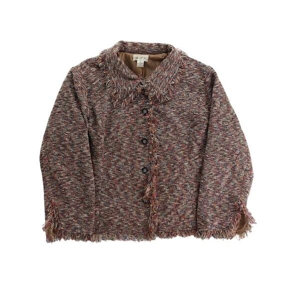 アジアン調のラグのようなネップ感あるファブリックと配色がとてもセンスの良いジャケット。襟、袖、裾はフリンジのような雰囲気が◎