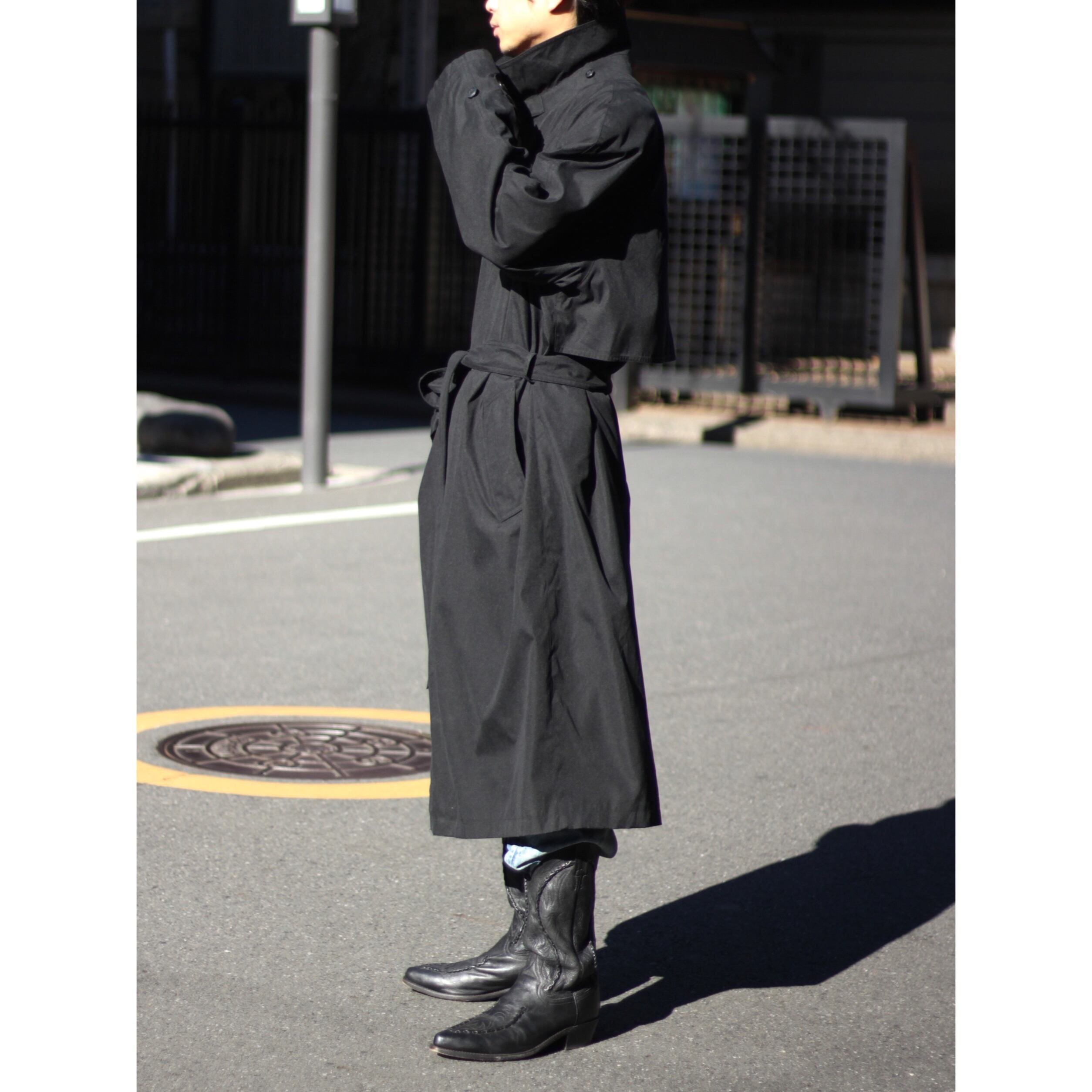 流行り廃り無く、気分的にも飽きが無いステンカラーディテール。フロントは比翼仕様でシンプルながらもラグジュアリーな印象。ステンカラーでは珍しいベルテッドディテールでギュッと絞ってシルエットの変化も。