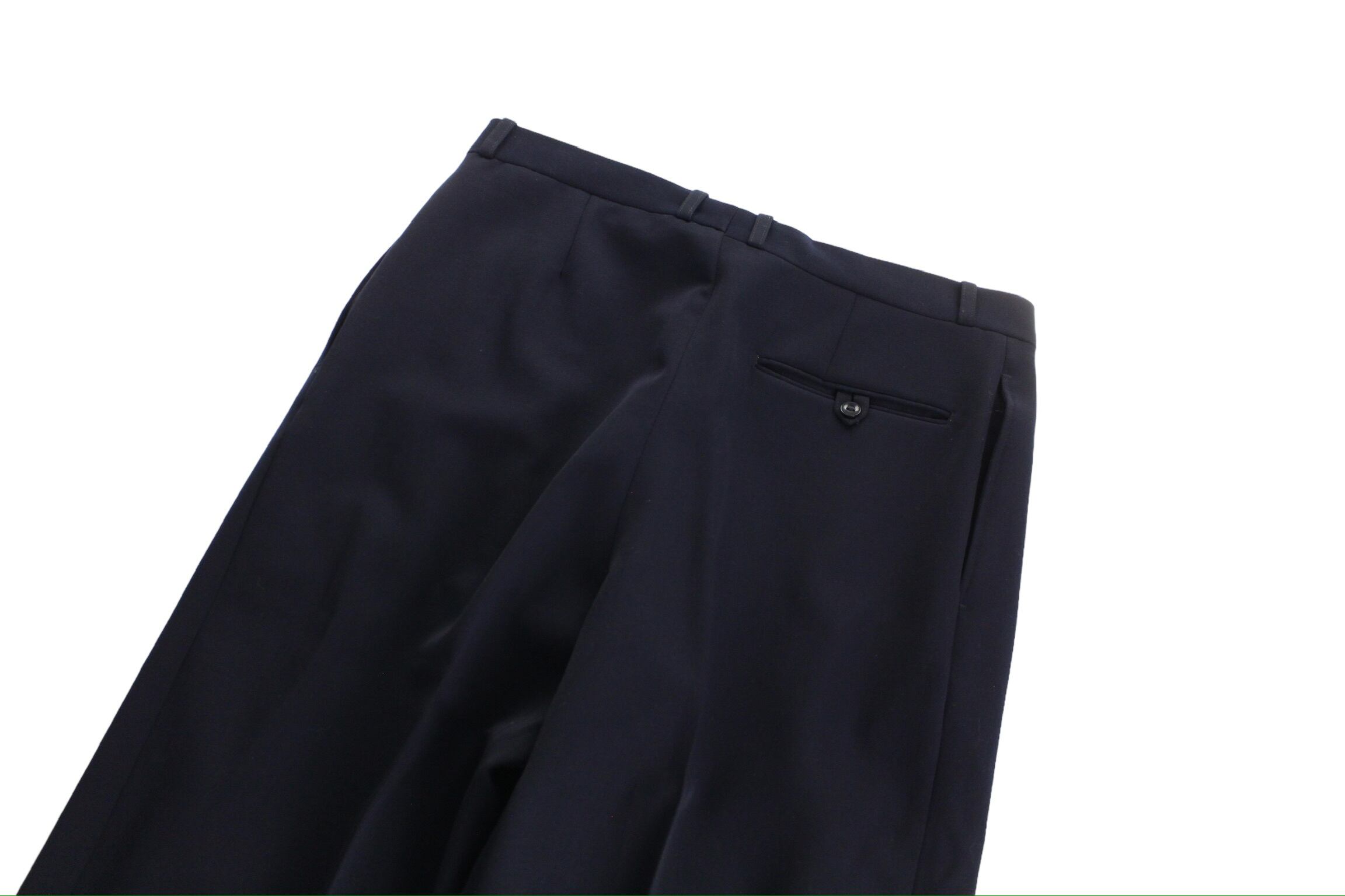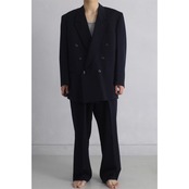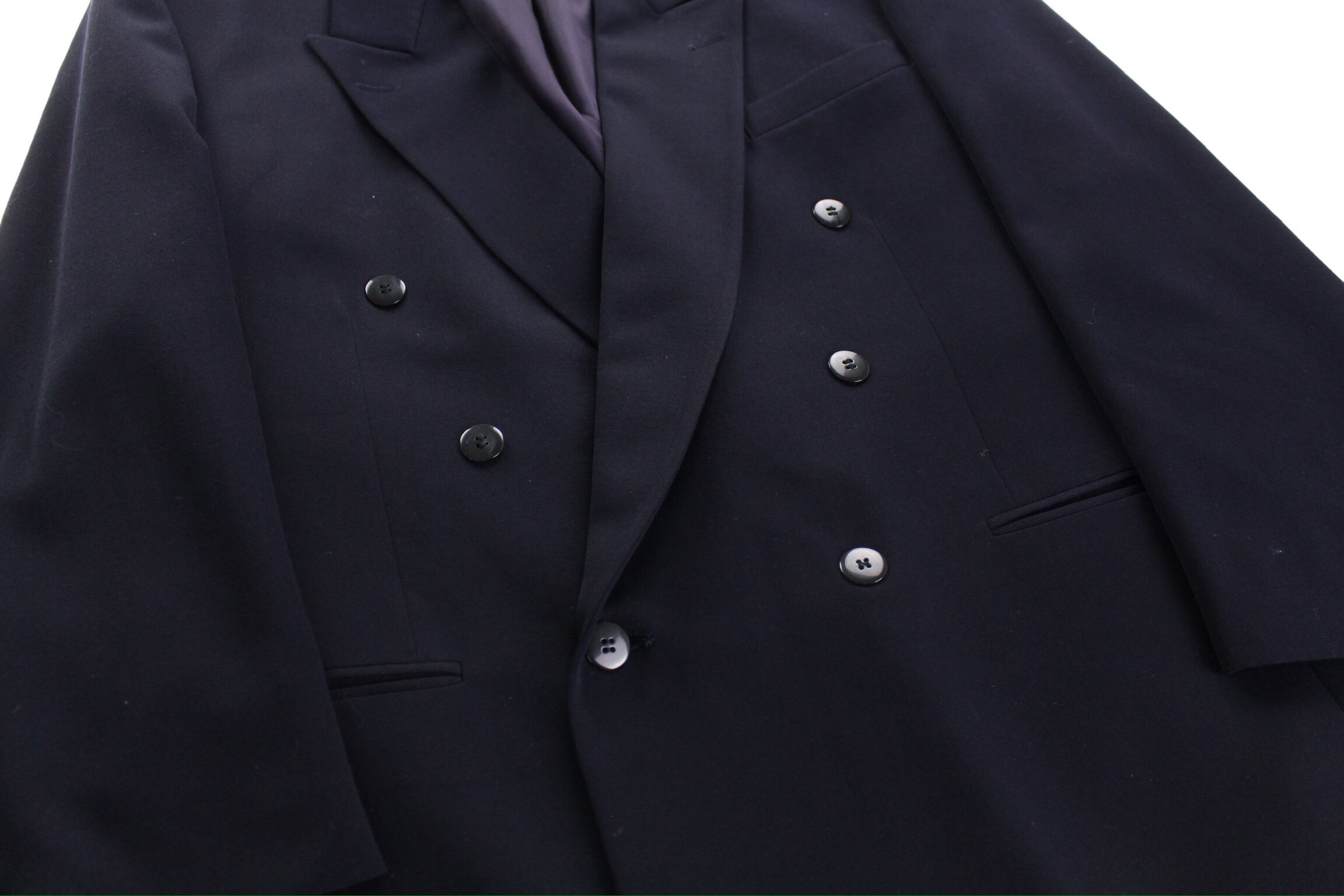 ダブルの仕立てで1ボタンのダブルブレスト仕様。ウールながらも滑らかな,起毛感のない贅沢なファブリックに,ほぼブラックのような美しいダークネイビーカラー。裏地はパープルアセテートで光沢のある非常に品のある大人なセットアップ。