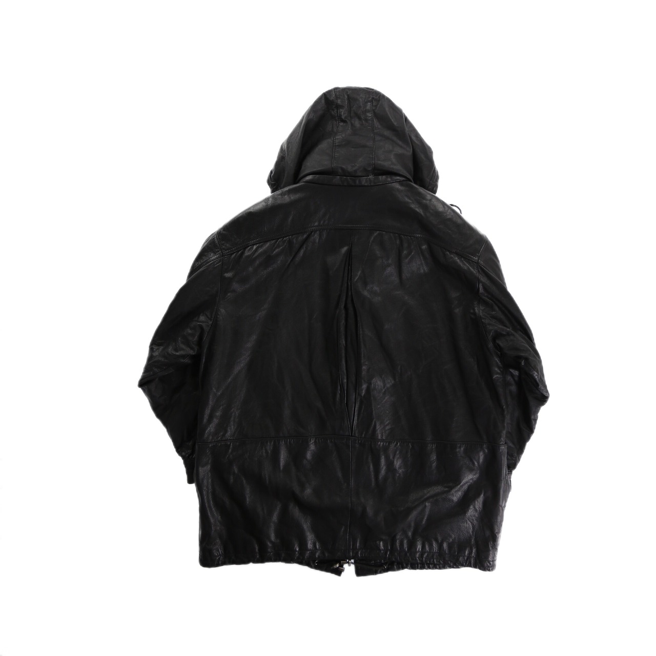 フロントジップアップで比翼デザイン。フードは取り外しが可能で外せばハイネックレザーとして着用が可能。モード味もありながらレザー特有の無骨さも失わない雰囲気抜群なアイテム。
