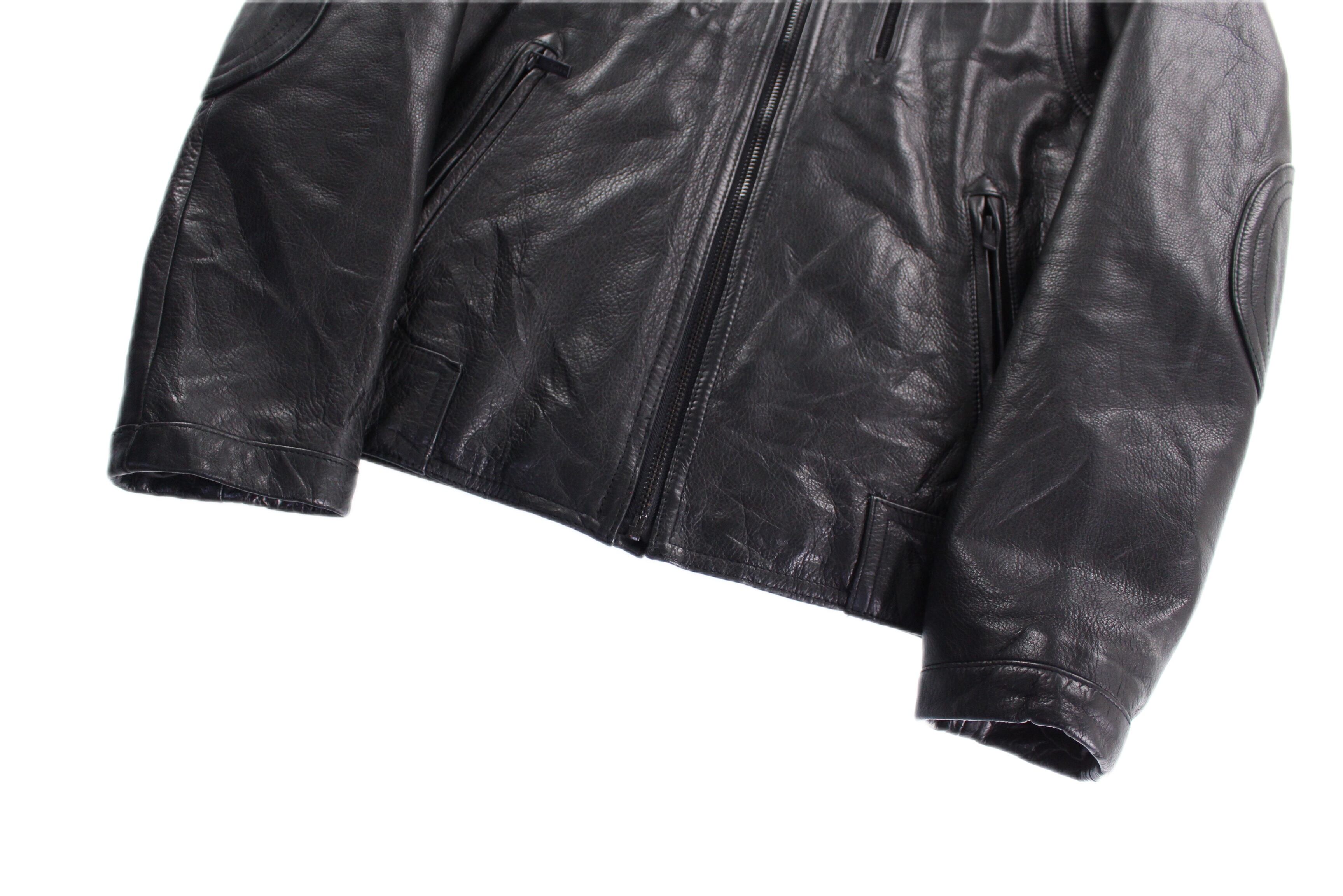フロントジップアップにトップにはベルトが付属。両サイド,胸ポケットにはジップアップポケット完備。サイドにも調整が効くスナップベルト付きでアームにはエルボーパッチデザイン。脇の下にはハトメ穴が付き,蒸れやすいレザーのデメリットをカバー。とにかくデザイン,機能性高いライダースジャケット。
