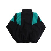 腕周りにかけて三角形がデザインされ胸元にはブランドネーム×ロゴ刺繍。ブラック主体のボディに90sらしいレトログリーンの配色は意外と着やすくて良い◎