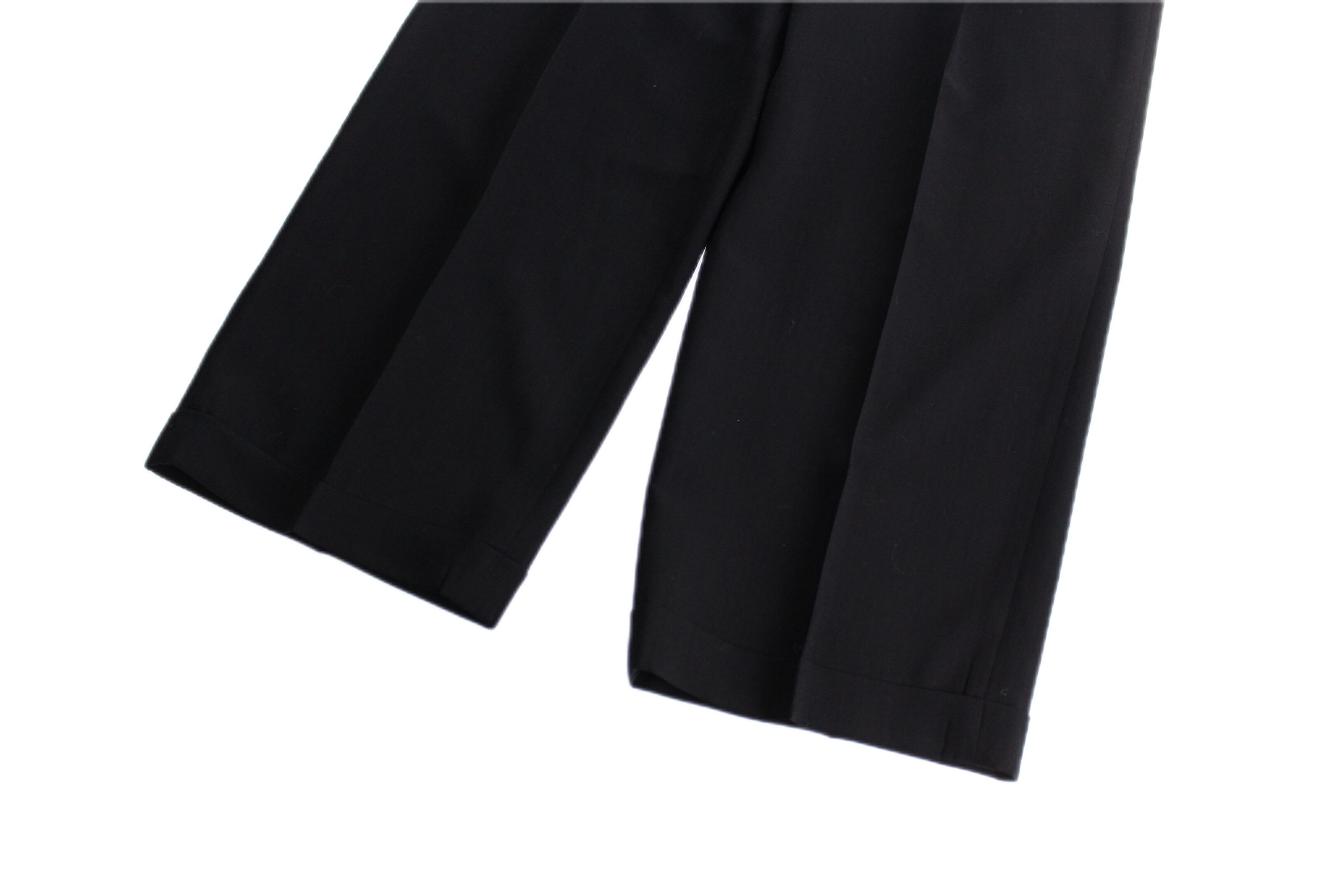 パンツは太めなウエストから来るワイドストレートのゆとりをもって作られた3タックスラックス。タックスラックスの中でも3タックが1番美しいと言われており,これがセットアップで着用できるとは,なんとも贅沢、、