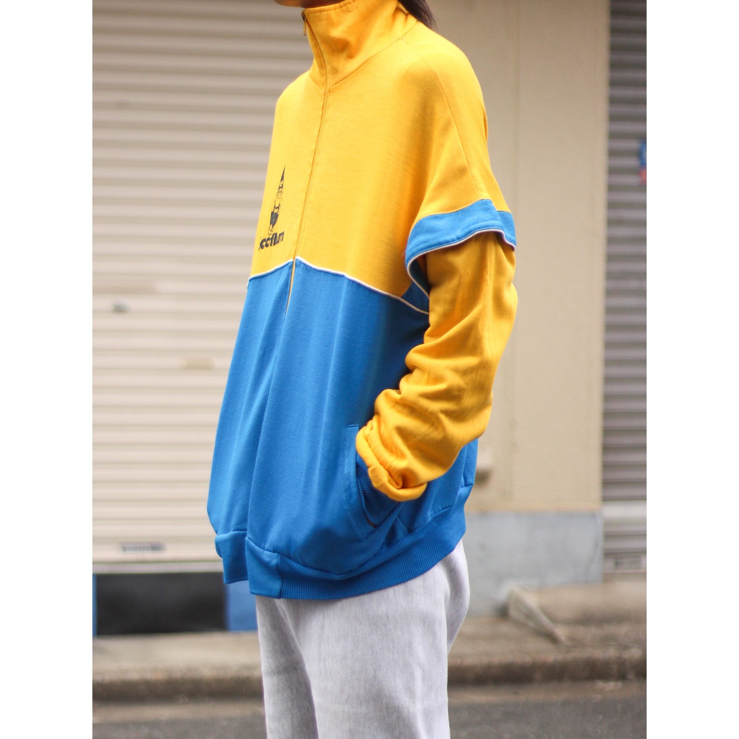 ハイネックのトラックジャージーのスタイルに、半袖にロングスリーブがドッキングしたかの様なデザインです。
