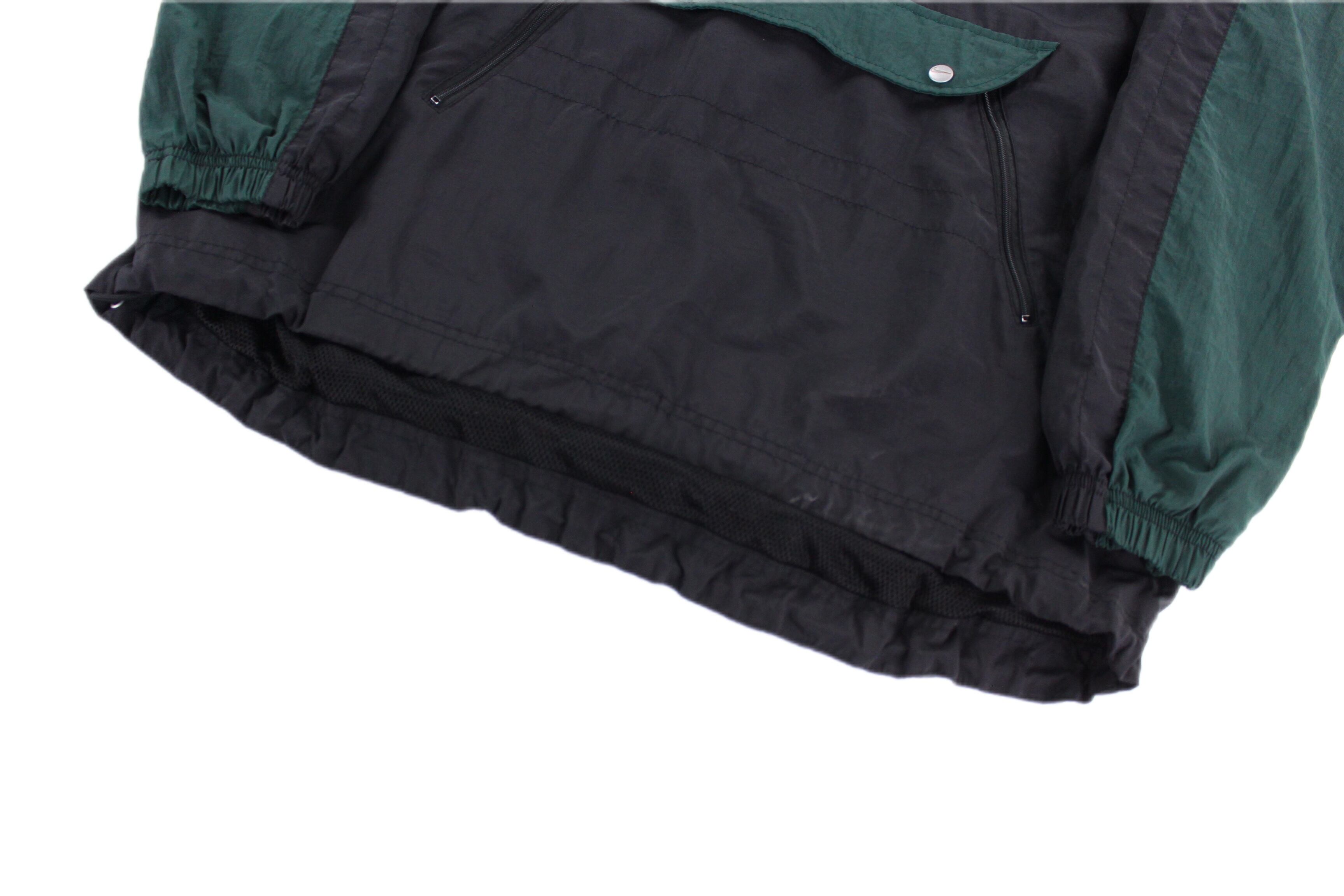 シャカシャカとした薄いナイロン地にフードやアーム,フロントのラインデザインが目を惹きます。グリーン×ブラック×ホワイトのクールな配色も◎