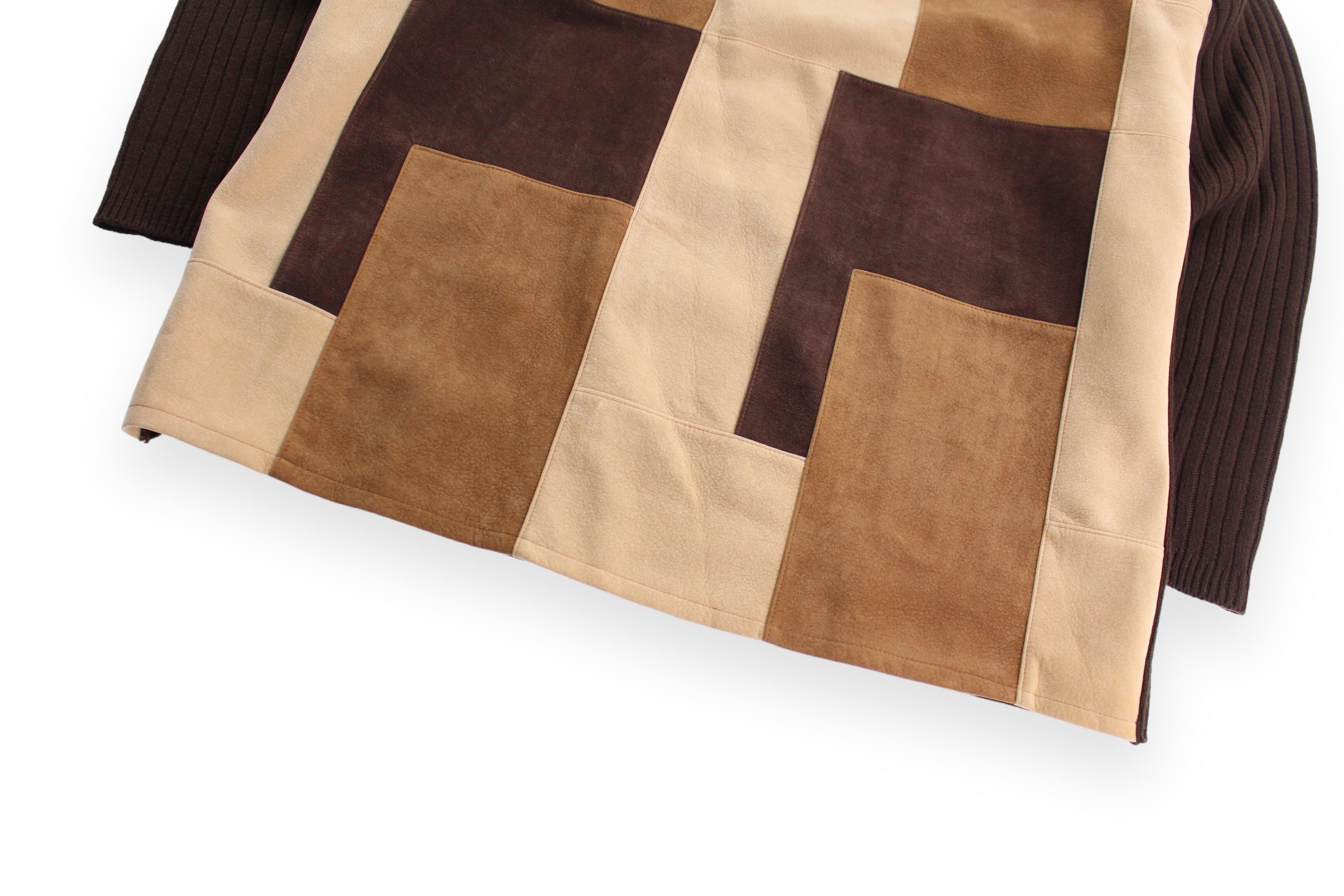 ブラウンボディにブラウンのフェイクスエードのパネルデザインが施されたされたとっても可愛いニット。
