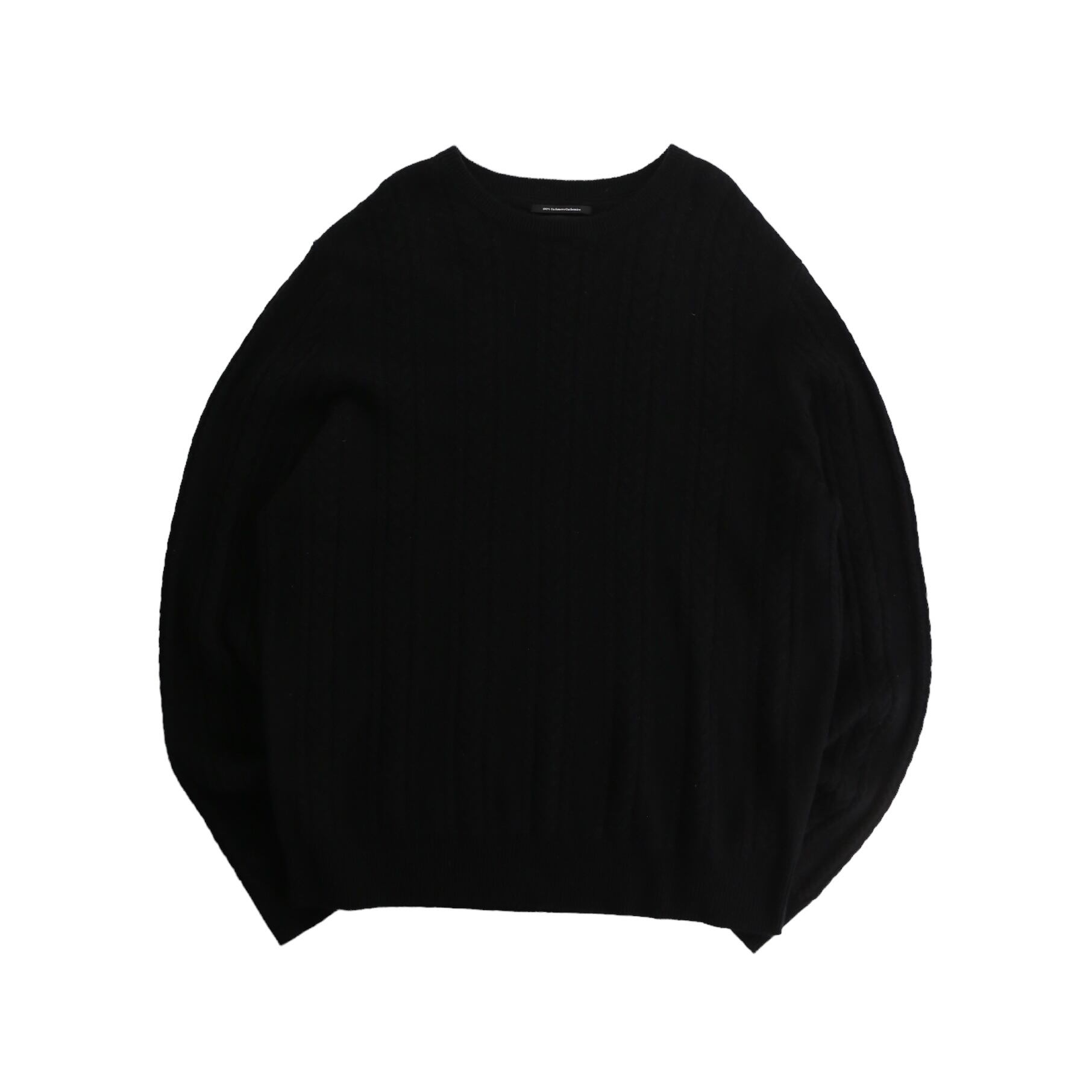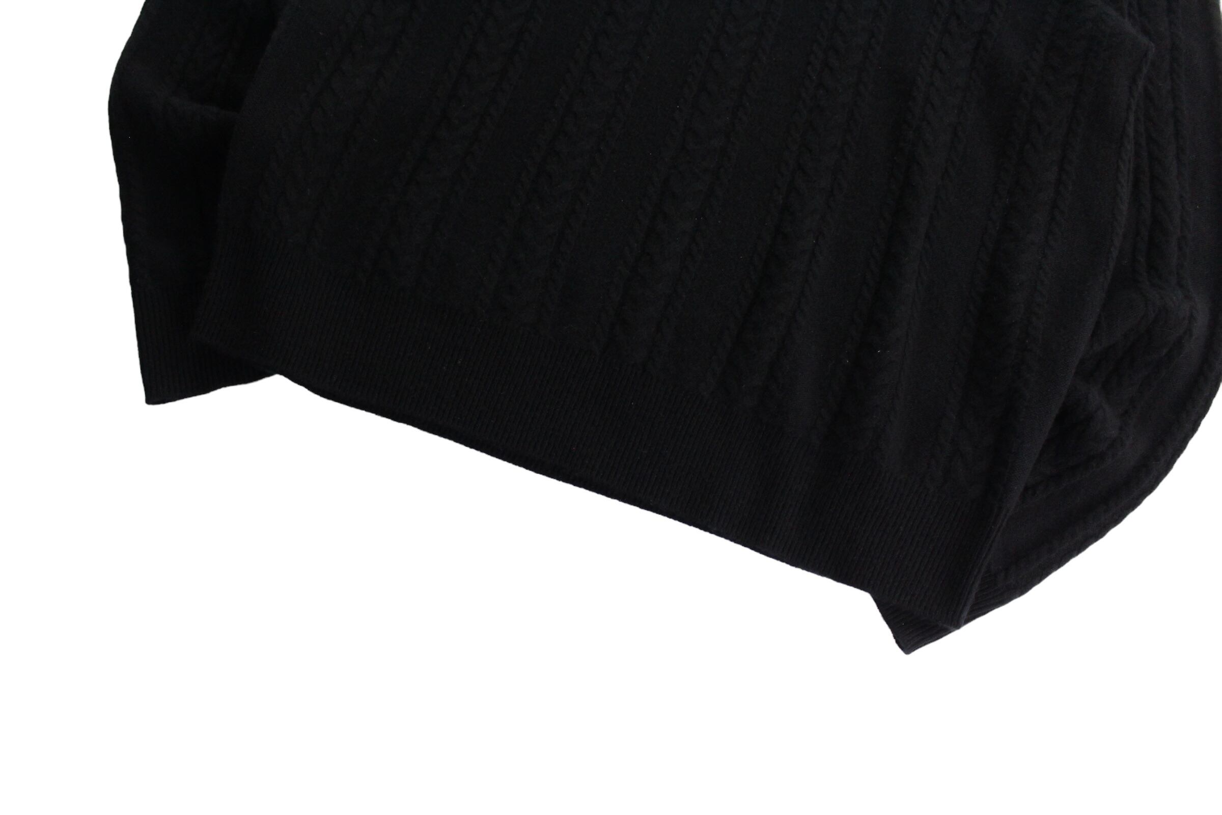 よく見るとケーブルのような編み方がとても特徴的でブラックカラーと相まってモードな印象に。
