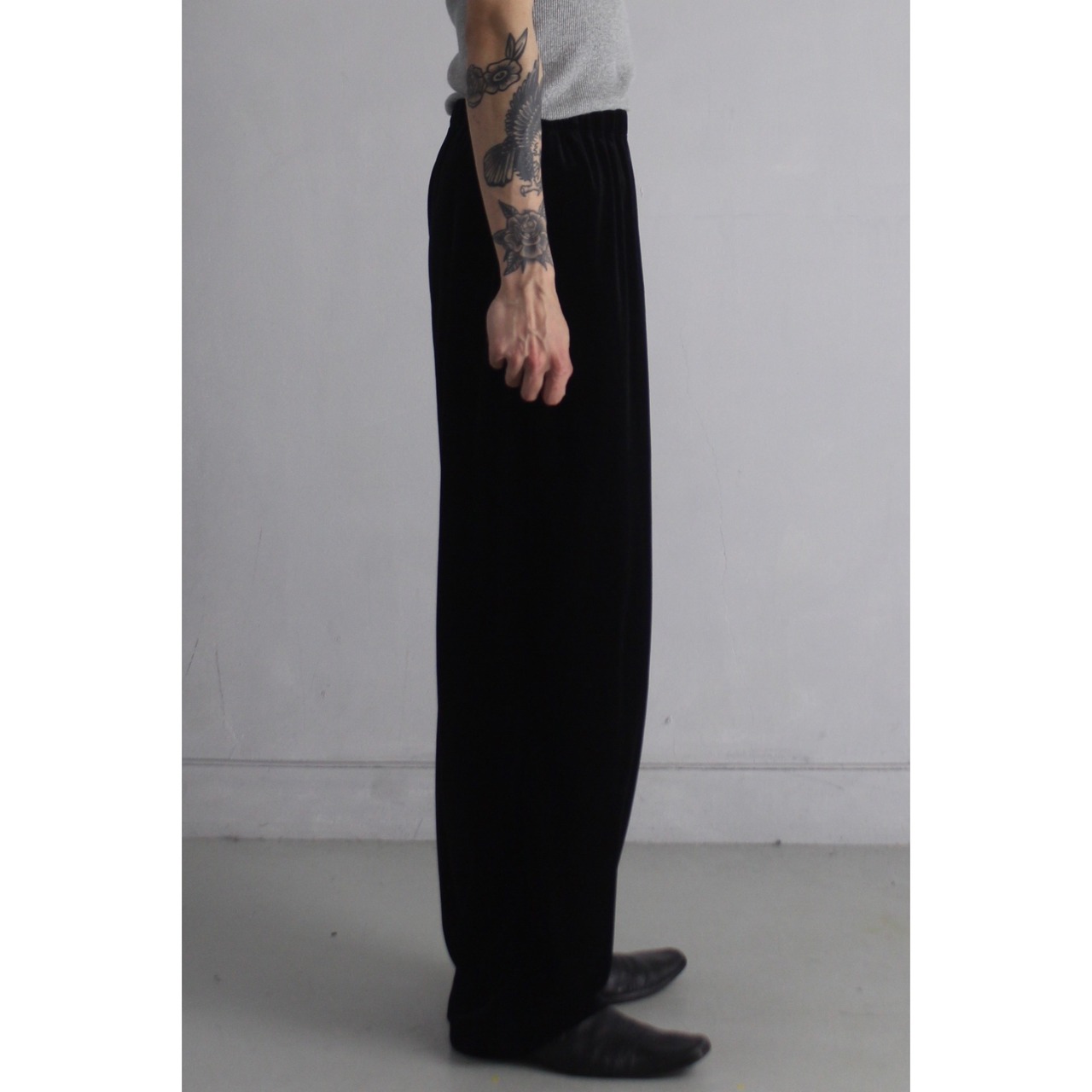 ベロアパンツは細身の物が多い中,ほぼストレートに落ちるワイドなシルエットで希少性も高い1着。ベロアの潰れも少なくツルッとした質感も楽しめます☺︎