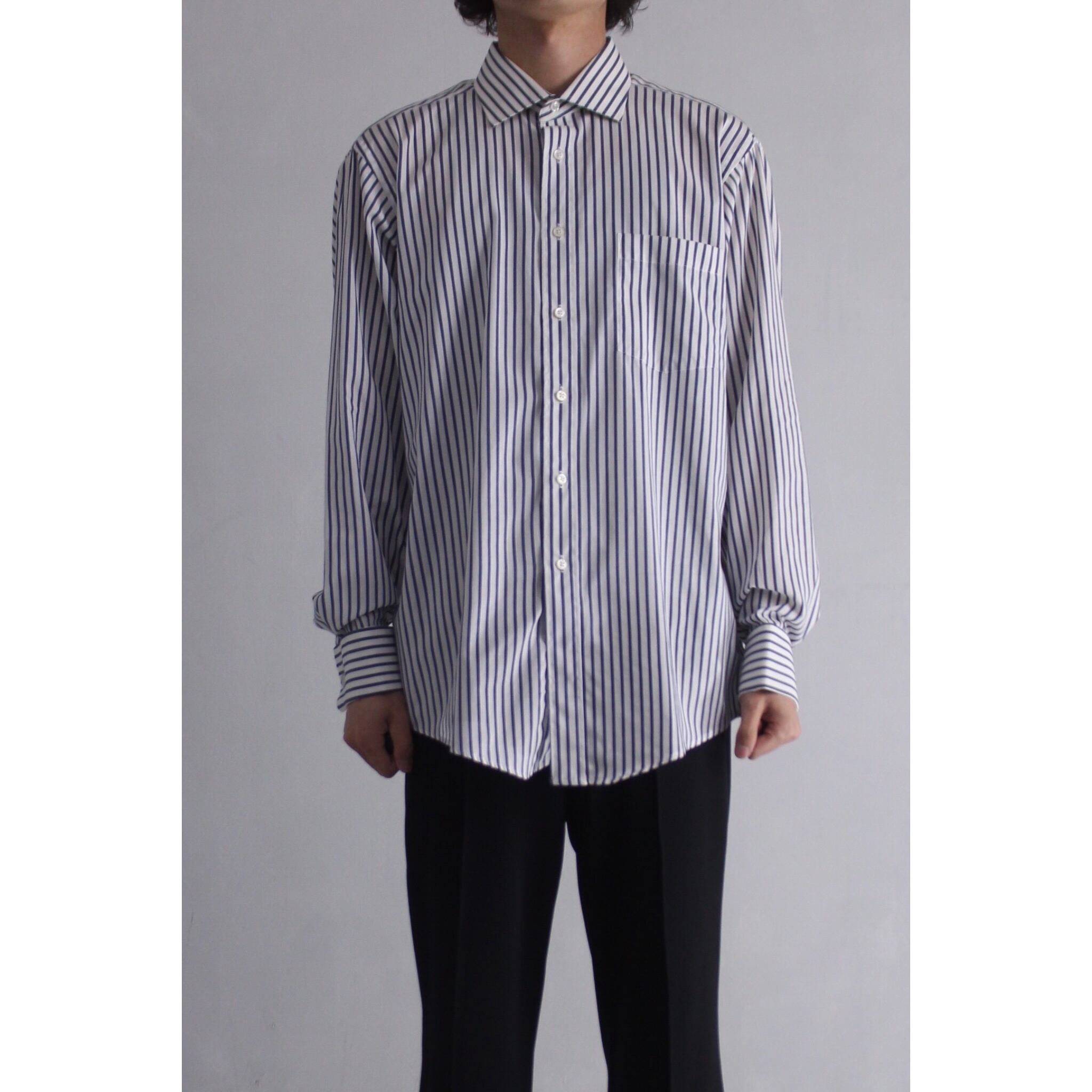 スモークブルー×ホワイトの王道ストライプカラーにブランドシャツでは珍しいルーズに着用可能なXL程度のサイズ感。羽織でも1枚でもサマになります☺︎