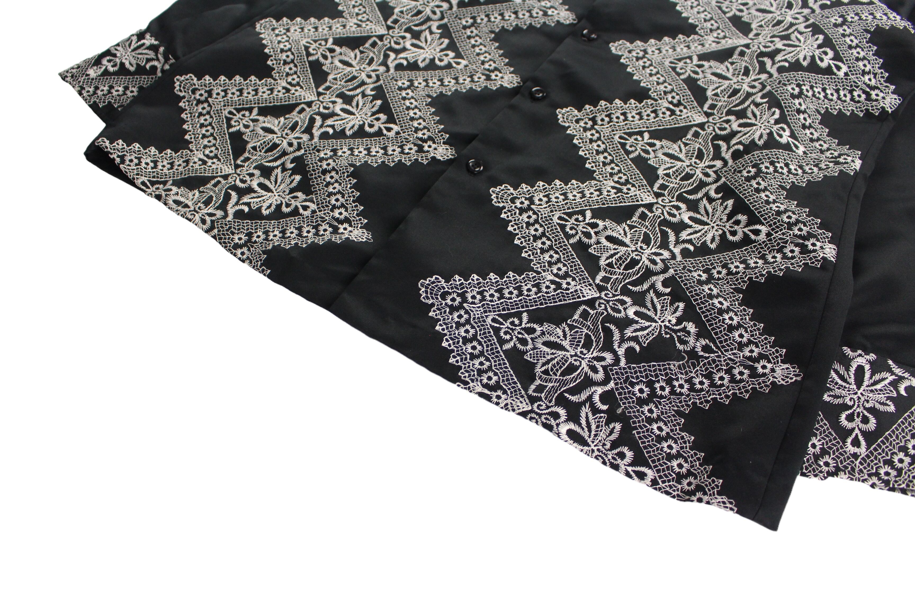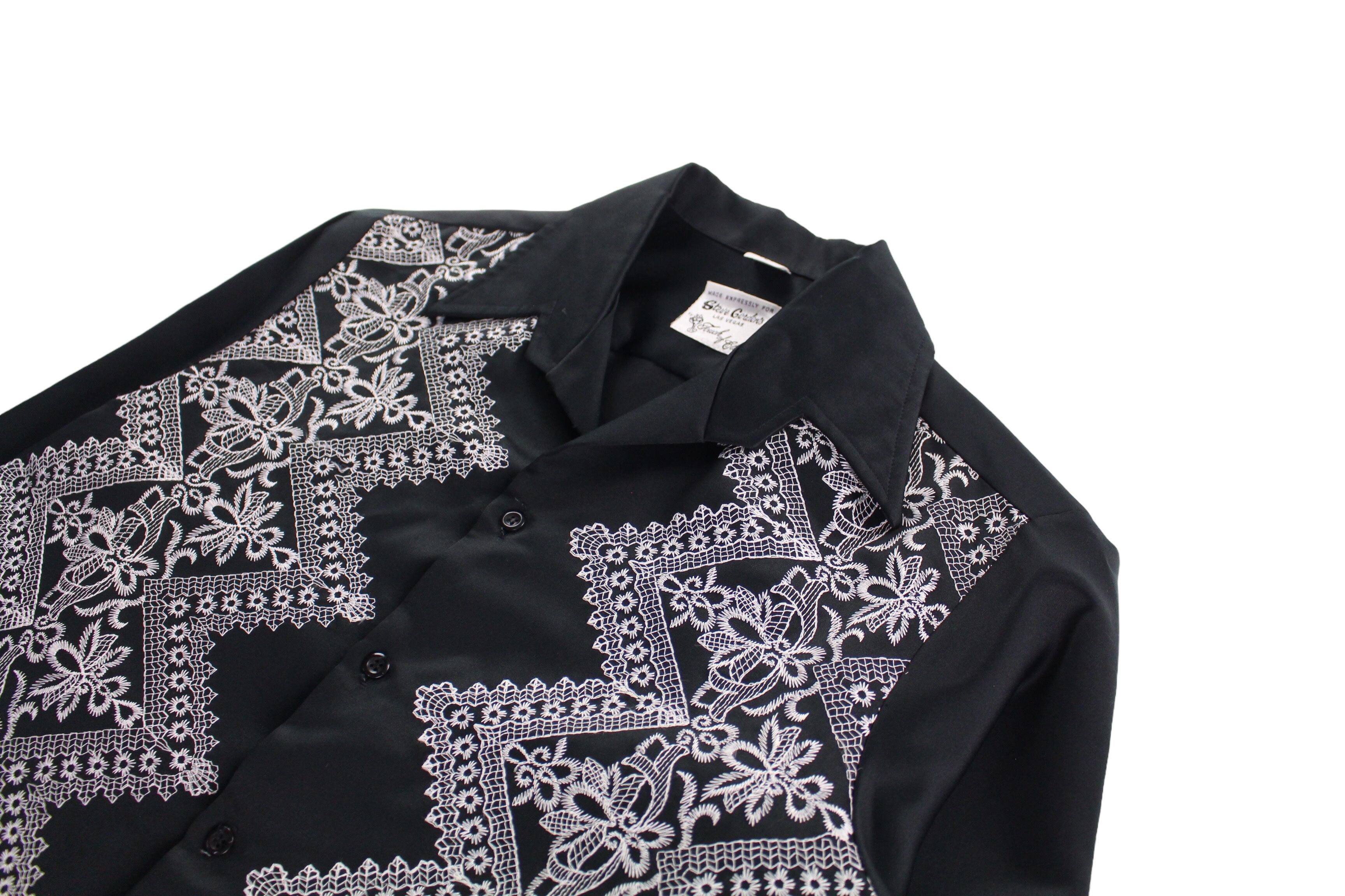 ブラックのサテン生地にクォリティの高い刺繍デザインはまるでブランド品のよう。ブラックのシャツでも軽やかな雰囲気で春のオールブラックスタイルにお勧め。トップスインナー共に優秀でコートなどから少し見せてあげる着方もとても良い。