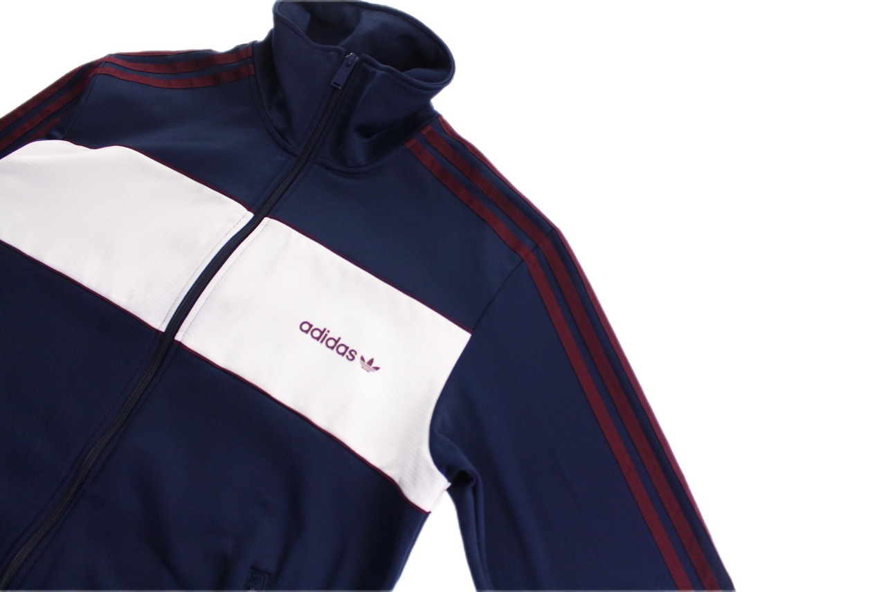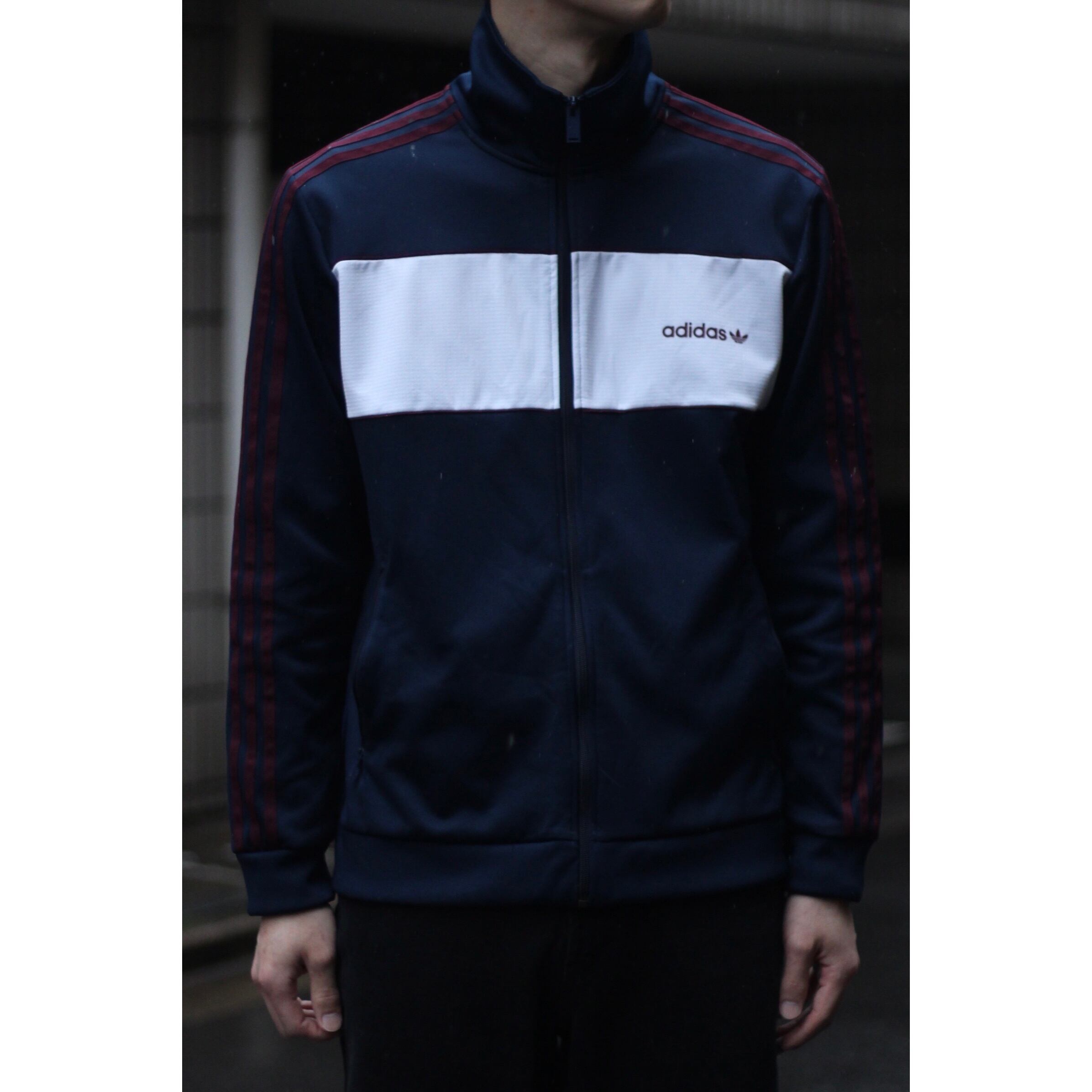 王道adidasのスリーラインデザインにジャージー生地。ネイビーボディにブランドを象徴するアーム三本エンジライン。真ん中にはホワイトの太めラインも入り,ブラック×ホワイトが圧倒的に多い中でのこの配色。レトロな配色が素晴らしいです☺︎