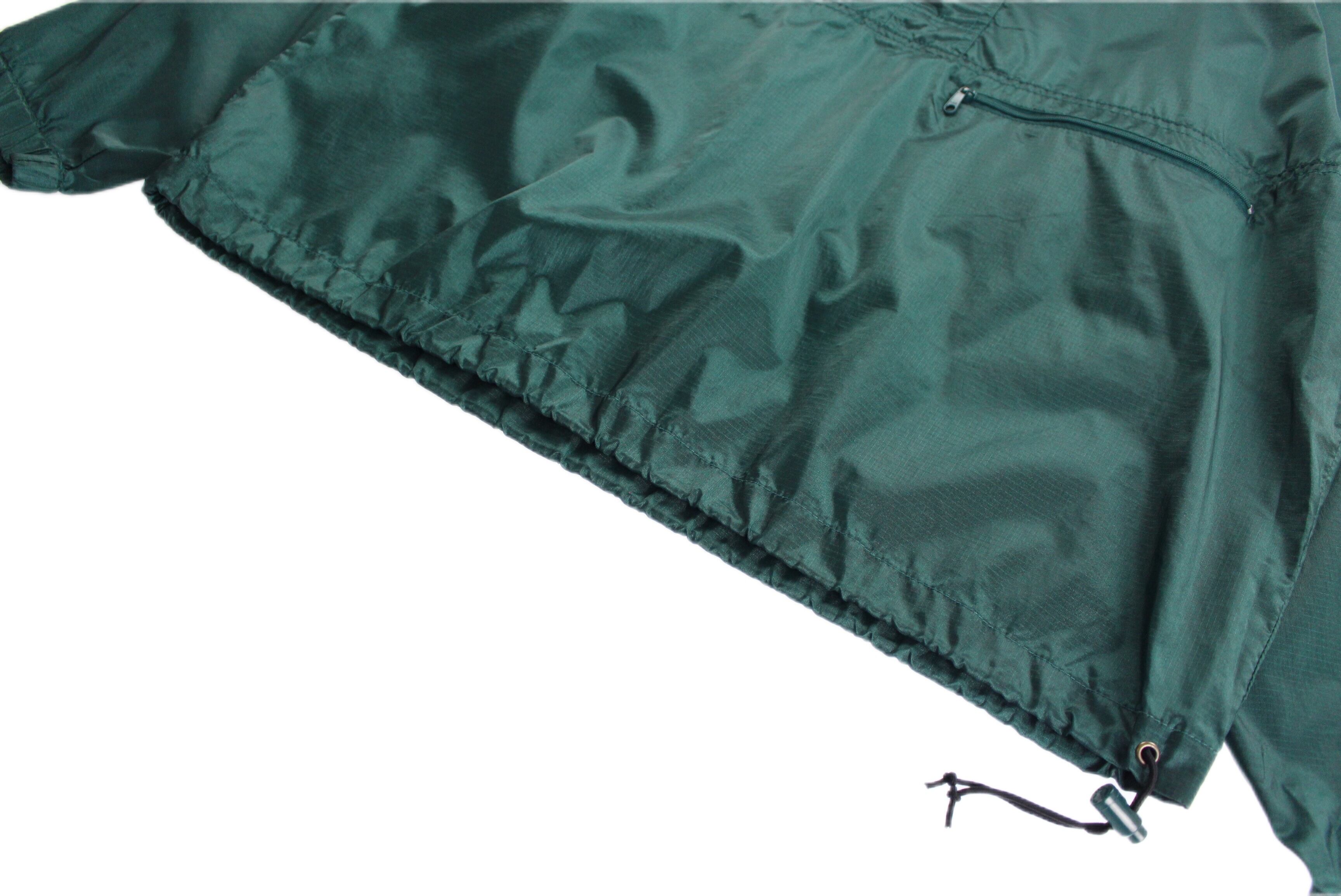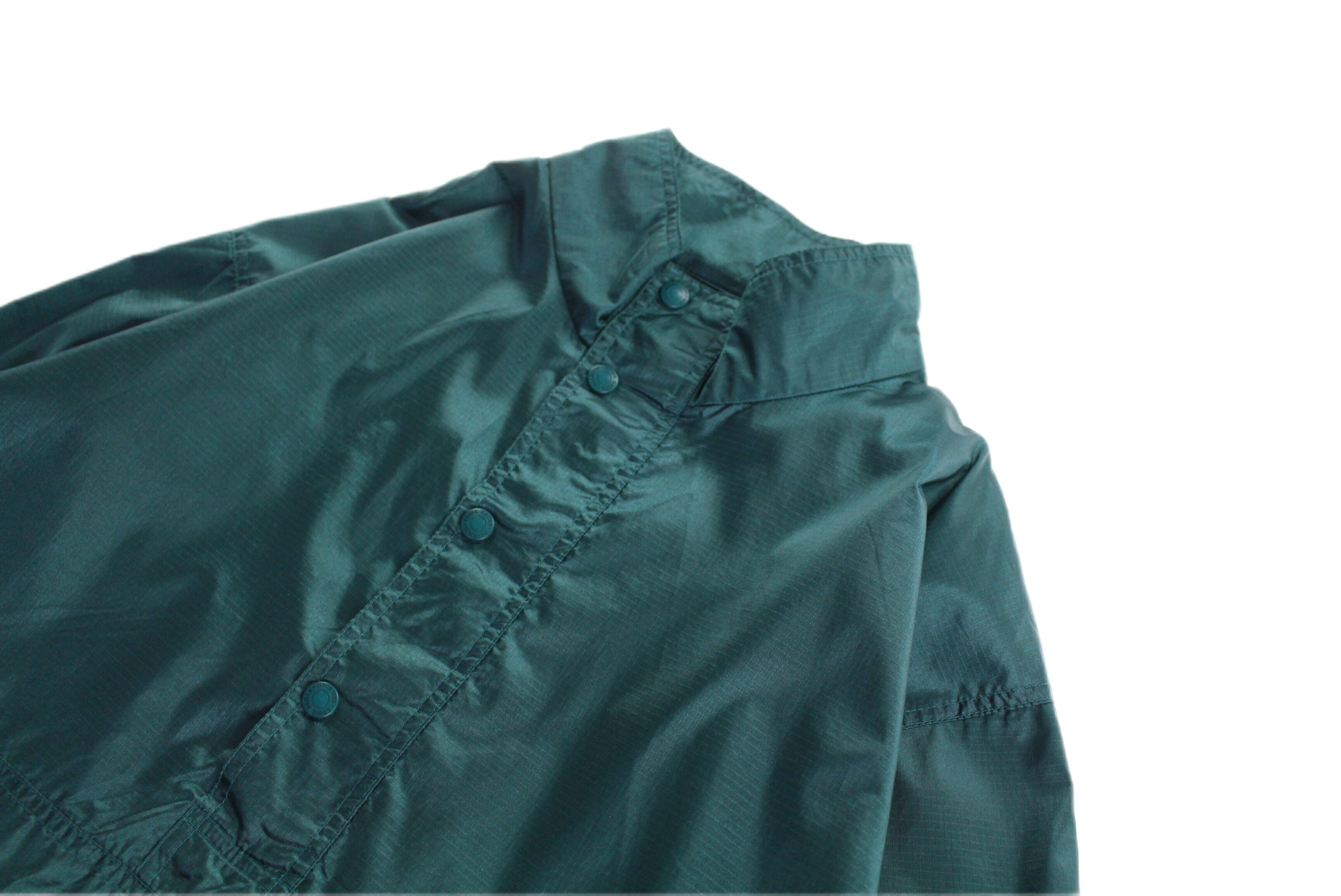 ナイロン特有の光沢によりほんのり玉虫がかった綺麗なグリーンに,なんの上からでもガバッと羽織れるルーズなサイズ感。とにかく軽くストレスなく悪天候でも決まるアイテム。