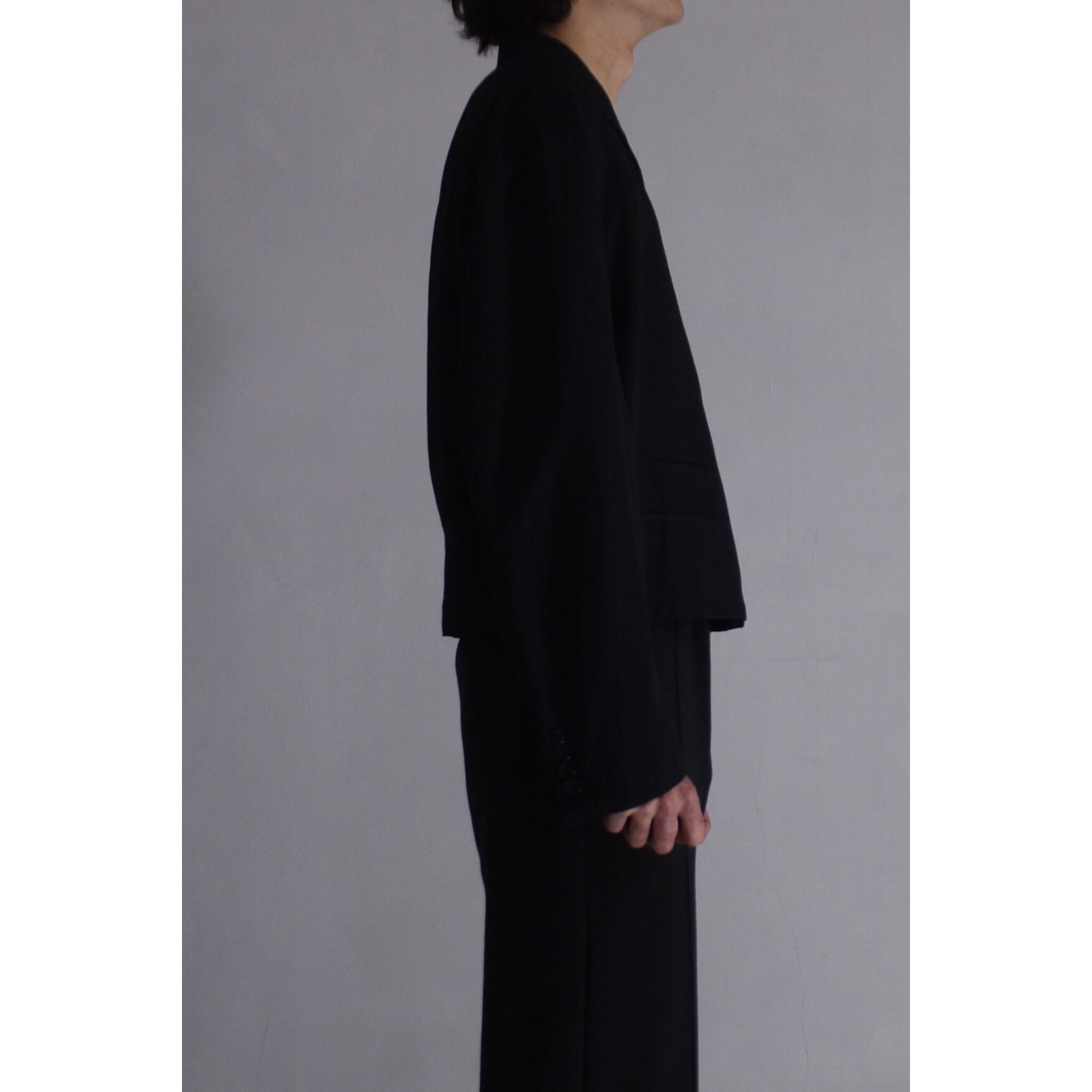 ビスコースナイロン混紡のギャバジン織。とにかく滑らかなスムースのような手触りの良い生地にハリがありながらも柔らかくとろみがある。ブラック無地で間違いなく汎用性も高い1着。