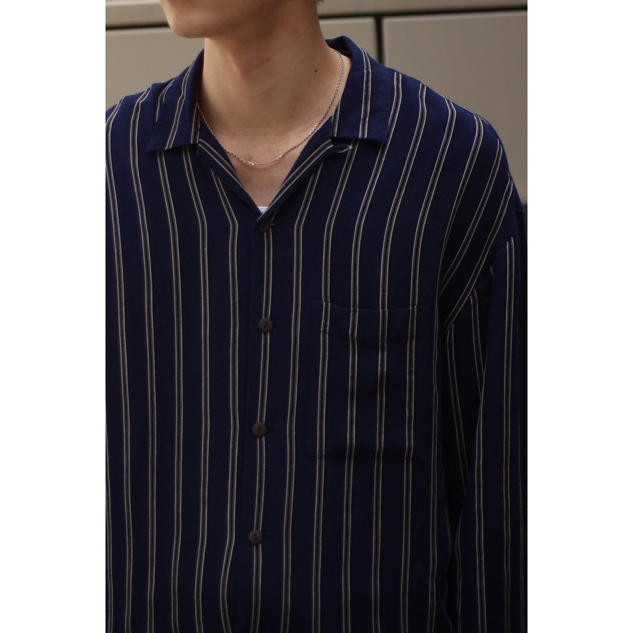 こちらはネイビーボディにオフホワイトのストライプデザイン。デフォルトは開襟仕様ですがボタンは1番上まで留めることも可能。