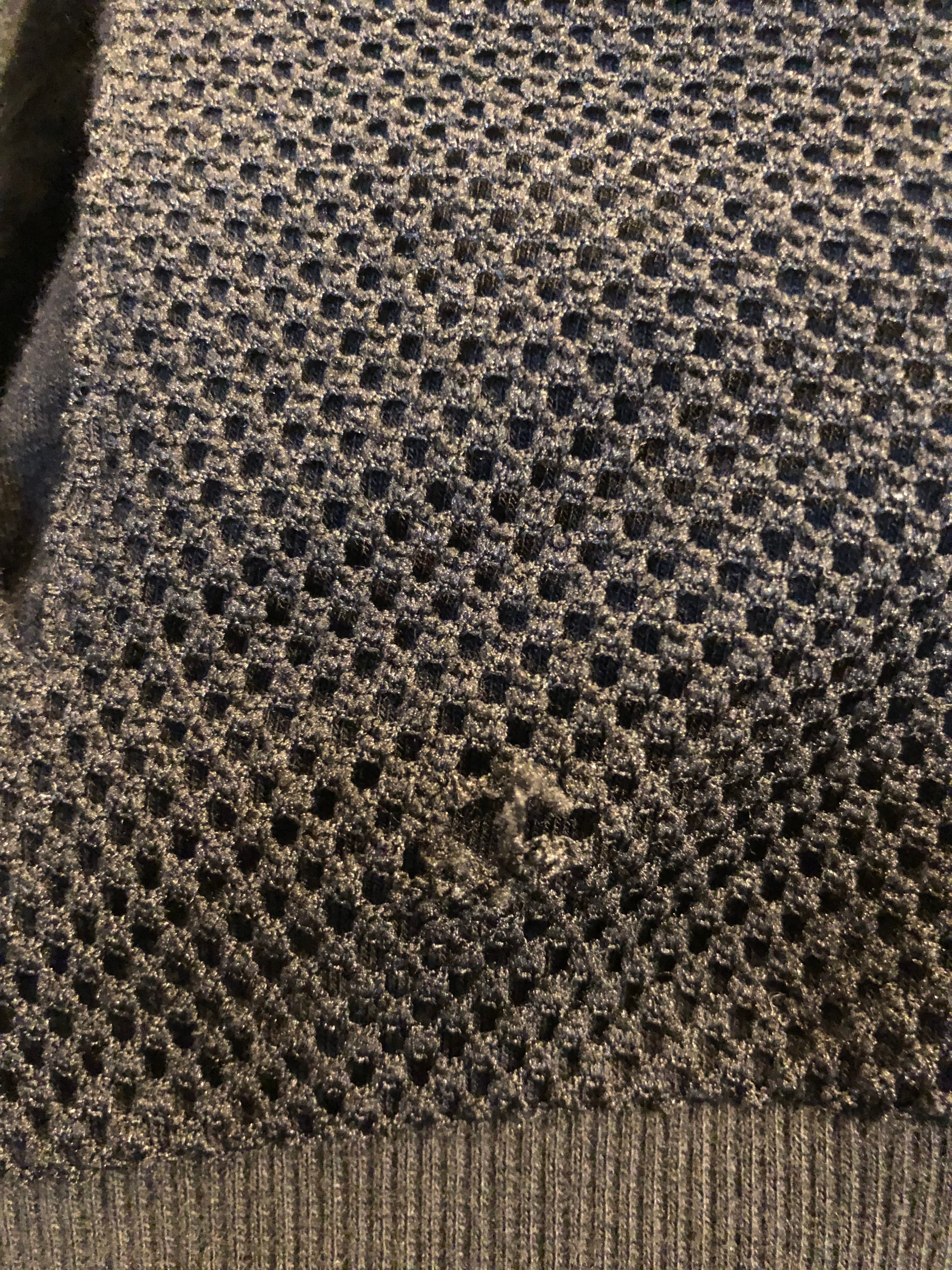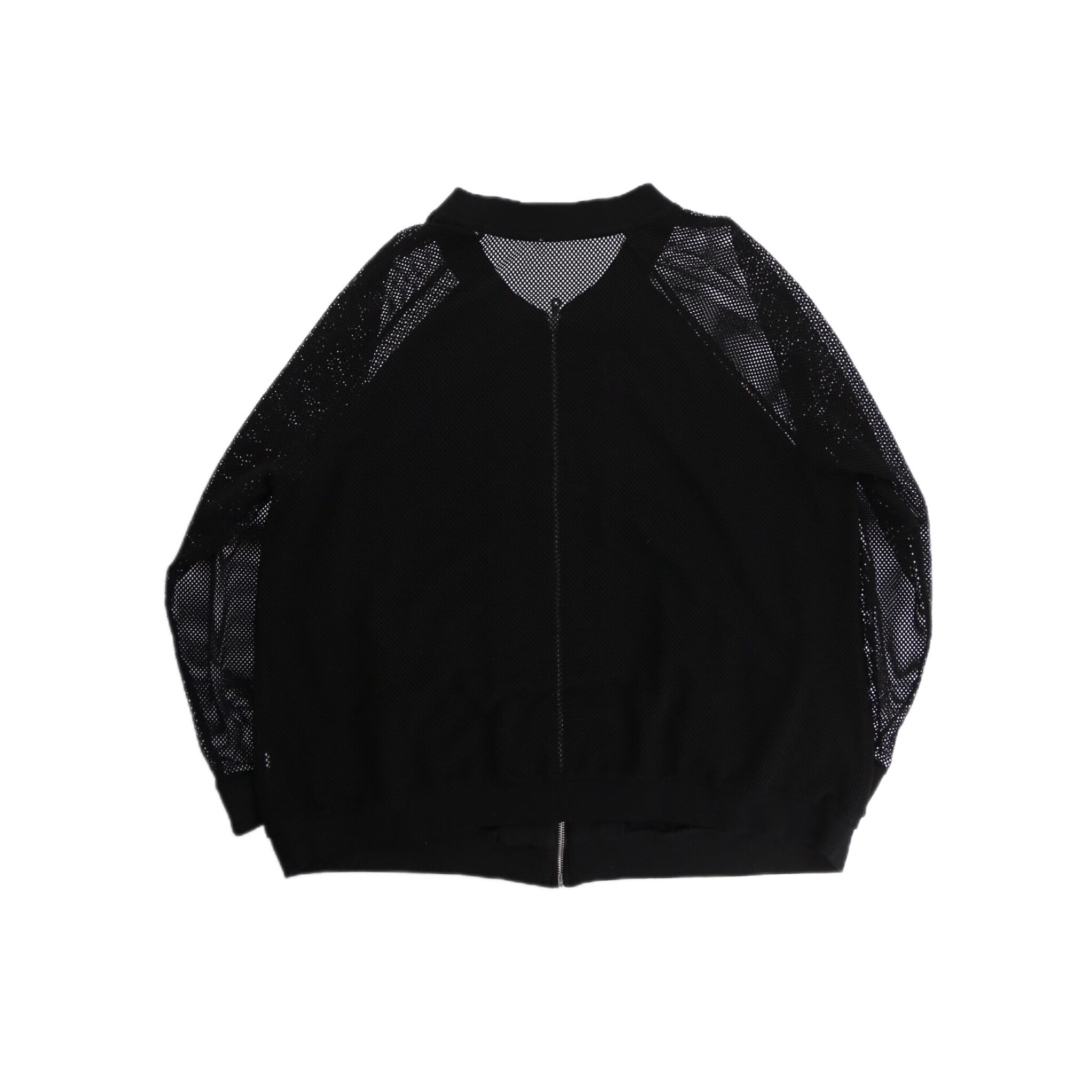 オールブラックで統一されたボディに透け感素晴らしいメッシュ生地。フロントジップアップで丸襟のブルゾン型。両サイドにはポケット完備。